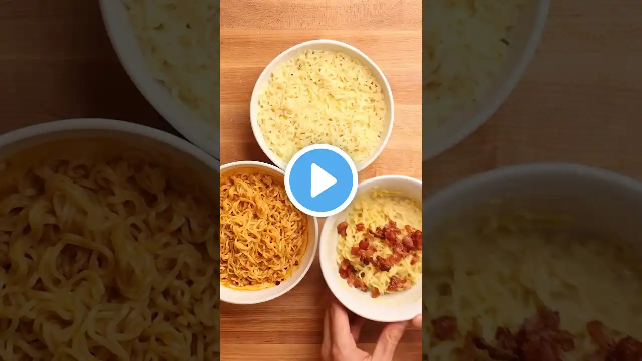 My top 3 easiest ways to level up your instant ramen. Check out each ramen method below in more detail! Method 1 (Creamy ramen broth): 1 egg yolk 1 tbsp mayonnaise 1 instant ramen packet Add egg yolk, mayonnaise and the ramen seasoning packets into a bowl and mix until a combined paste. Boil noodles to packet instructions. Reserve cooking water and pour about 4-5 tbsp’s of it into the seasoning paste. Stir until you get a rich, creamy broth. Top with noodles, green onions, and sesame seeds. Method 2 (Sizzling glazed noodles): 1 garlic clove, minced 2 green onions, white ends finely sliced 1 instant ramen packet 2 tbsp neutral oil 2 tsp rice wine vinegar Add garlic, white ends of green onions and seasoning packets to a bowl. Boil noodles to packet instructions while cooking an egg in the neutral oil or just heating it up. Pour the hot oil into the seasoning bowl and stir then add the vinegar. Add the noodles and toss to coat them. Serve with chopped green onions and sesame seeds. Method 3 (Ramen egg drop soup): 1 stock cube 1 instant ramen packet 1 tsp corn starch 1 egg, beaten Add a chicken stock cube to 500ml boiling water. In a bowl, mix corn starch with 2tsp of cold water to make a slurry then slowly pour into the simmering chicken stock while stirring. Also while stirring, slowly pour in the beaten egg to create thin ribbons of egg. Add your noodles and cook to packet instructions. Add the seasoning packets and mix them in. Serve with chopped green onions, sesame seeds and a dash of sesame oil. #cooking #food #easyrecipe #ramen