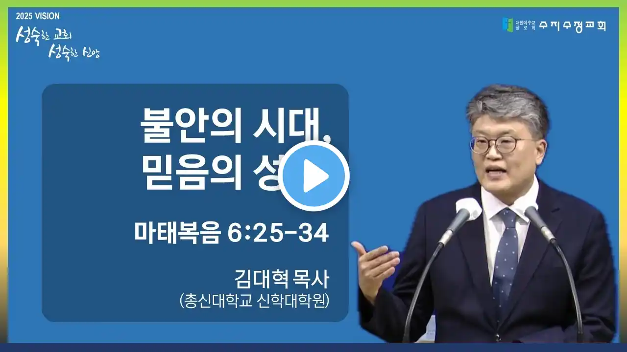 #수정교회 #수지수정교회 #주일2부예배 #김대혁목사 #주일 #예배 수지수정교회 2025년 6월 22일 주일 2부 예배 본문 : 마태복음 6:25-34 제목 : 불안의 시대, 믿음의 성도 수지수정교회 연락처 : 031-265-5091 수지수정교회 주소 : 경기도 용인시 수지구 정평로 34-3 수지수정교회 수지수정교회 홈페이지 : https://www.sujisujung.kr ▒▒▒ 온라인 예배 안내 ▒▒▒ 주일 오전 예배 | 오전 09:00, 11:00 주일 테마 예배 | 오후 13:30 수요 오전 예배 | 오전 10:30 금요기도회 | 오후 21:00 새벽 예배 | 오전 05:00 *구독과 알림 설정으로 교회 소식과 예배 및 행사 영상을 받아보실 수 있습니다. 예배전 BGM : 크리스찬 BGM • [2시간] BE STILL - 깊은 기도로 인도하는 음악 / Deep Pra...