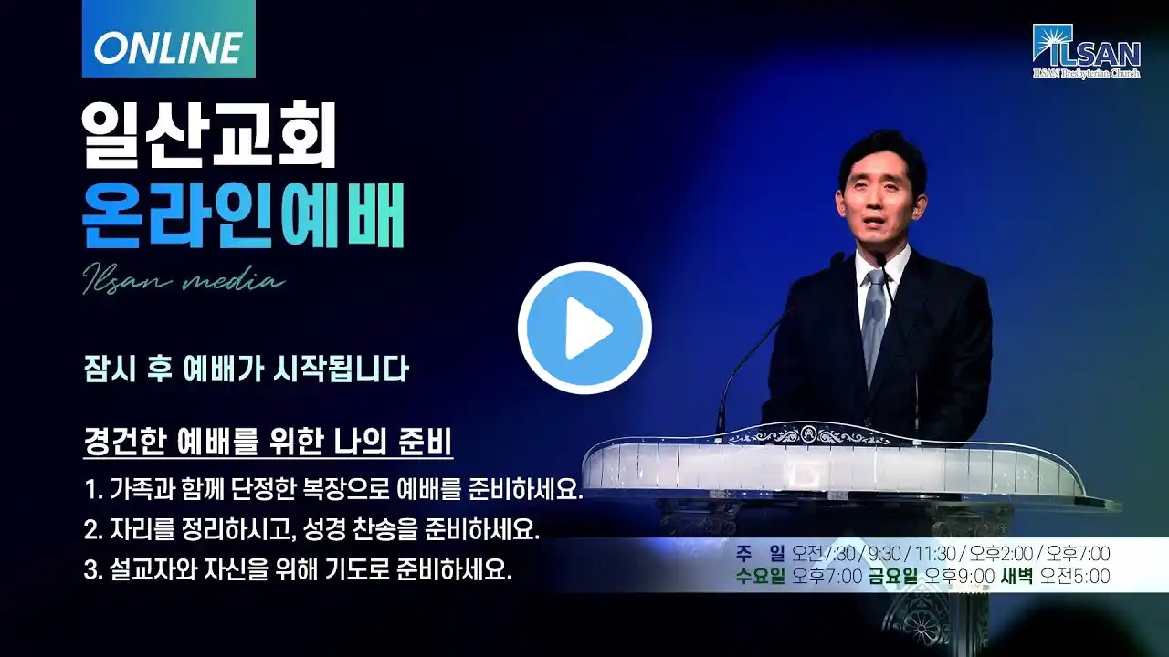 주후 2020년 11월 11일(수) 일산교회 추수감사절 전교우 특별새벽기도 예배 안내 설교자- 윤상덕 담임목사 설교 본문- 시편 73:1-28 설교 제목- 하늘에서나 땅에서나 주 밖에 없나이다 일산교회는 CCLI로 부터 교회 저작권 라이선스와 스트리밍 라이선스를 취득하였습니다. 일산교회 CCLI License : #610212 CCLI Streaming License : #14959