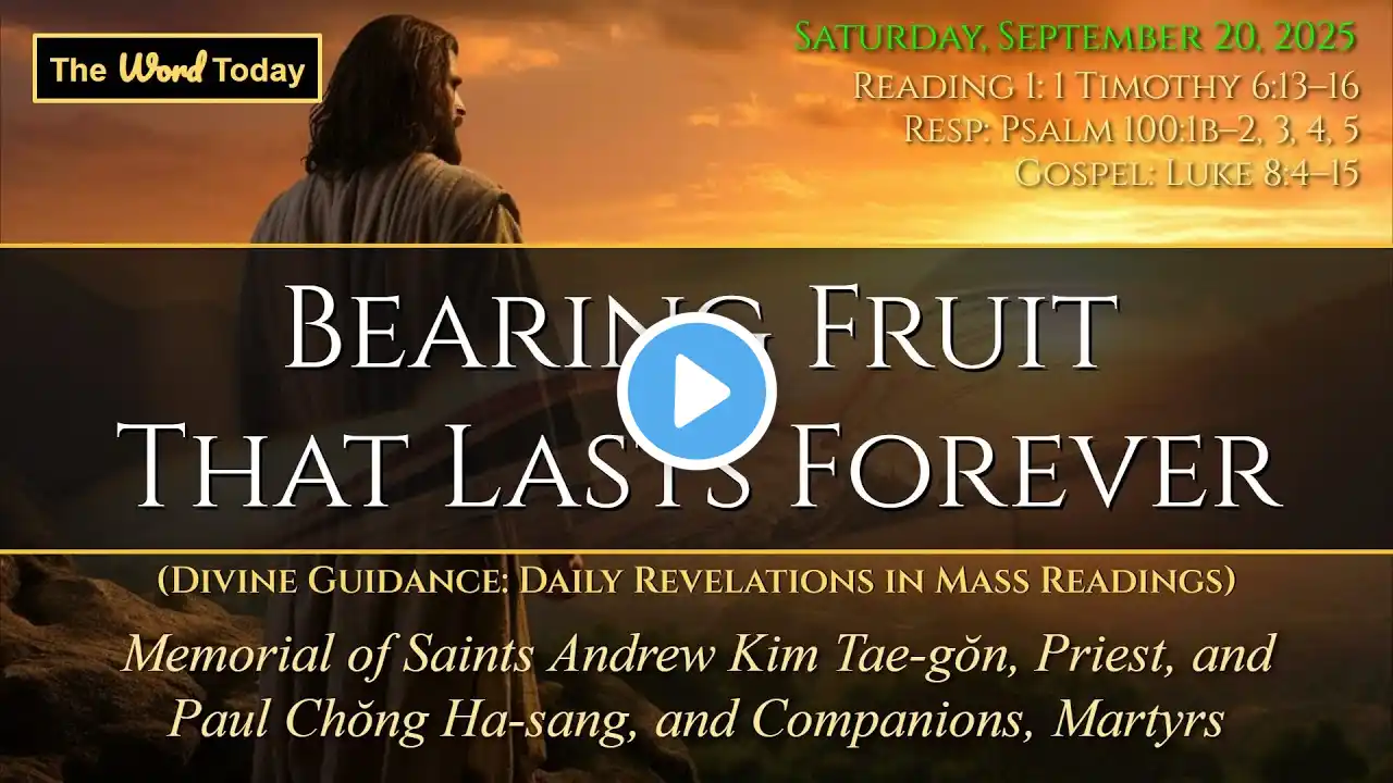 Daily Catholic Mass September 20, 2025 | Complete Mass with homily, Gospel Luke 8:4–15, First Reading 1 Timothy 6:13–16, spiritual communion, prayers, and reflection. Welcome to the DAILY MASS | September 20, 2025 | When Faith Bears Fruit. Today’s liturgy calls us to reflect on the Parable of the Sower (Luke 8:4–15). The Word of God is the seed that never tires, scattered generously by the Lord, waiting for hearts ready to bear fruit through perseverance. In the first reading, Saint Paul exhorts Timothy (1 Tim 6:13–16) to live blamelessly before the King of kings, the Lord of lords, who dwells in unapproachable light. The Gospel reminds us that some seed falls on the path, some among rocks, others among thorns—but the seed in good soil produces fruit a hundredfold. Today we also remember the Korean Martyrs—Saint Andrew Kim Taegon, Saint Paul Chong Hasang, and companions—who show us how faith can endure persecution and bear lasting fruit. Their lives inspire us to remain constant and to let God’s Word transform our daily lives. 🙏 Community Intentions: We pray for the sick, for families, for peace, for work with dignity, and for all who leave intentions here. ✨ If this Mass strengthens your faith, don’t just watch—subscribe and share. Every like, comment, and prayer helps spread the Word of God further. You are part of this mission. ⏰ Timeline / Chapters 00:00 Greeting and introduction 03:00 Penitential Act and Gloria 07:30 Opening Prayer (Collect) 09:40 First Reading: 1 Timothy 6:13–16 14:40 Responsorial Psalm 16:50 Gospel: Luke 8:4–15 – The Parable of the Sower 22:40 Homily – “When Faith Bears Fruit” 44:30 Profession of Faith (Creed) 49:00 Universal Prayer (Prayers of the Faithful) 56:10 Spiritual Communion (St. Alphonsus Liguori) 01:03:30 Prayer to Guardian Angel 01:07:30 Prayer to St. Michael the Archangel 01:12:40 The Angelus 01:18:30 Prayer for the Pope 01:23:00 Memorial of the Korean Martyrs 01:44:00 Thanksgiving 01:50:00 Final Blessing and Sending 🙏 Call to Action (CTA) ➡️ Subscribe to join the daily Mass every morning. ➡️ Comment with your intentions—we pray together as one family. ➡️ Share this video with your loved ones; your gesture can bring hope to someone in need. daily catholic mass september 20 2025, catholic mass today, daily mass today, gospel of the day luke 8 4 15, homily today, catholic liturgy today, mass with homily, mass with prayers, daily catholic eucharist, saint andrew kim taegon mass, korean martyrs catholic, complete catholic mass, catholic mass daily reflection, mass today english, word of god today, parable of the sower #DailyMass #CatholicMass #GospelOfTheDay #HolyMass #CatholicLiturgy #Homily #ParableOfTheSower #FaithThatBearsFruit Share this daily Mass on WhatsApp if something inside you was stirred. You didn’t arrive here by chance. It was God. Because He still speaks… And daily Mass is one of His most powerful ways to do it. Subscribe if you felt this word wasn’t just for you, but also for someone who needs to hear His voice again. This Mass is not entertainment. It’s not just another video. It’s a sacred moment. An invisible altar between your soul and heaven. An invitation to wake up. Turn on notifications if you’re seeking to hear God every day, not just when things go wrong. We’re not here to give you pretty phrases. We’re here to remind you of what the world has forgotten: that daily Mass is fire, it’s truth, it’s food for the soul. If something moved within you during this celebration, write it in the comments: “I need daily Mass” That tells us you’re not here out of habit… but out of spiritual hunger. Subscribe if you’re tired of living on autopilot and want to begin each day in the presence of God, with a Mass that doesn’t put you to sleep—but sets your heart on fire. / @amen360-en And share this Mass with someone who needs to reconnect with what truly matters. Because when even one soul listens to Mass with faith, all of heaven moves. This is just the beginning. And tomorrow… there’s more.