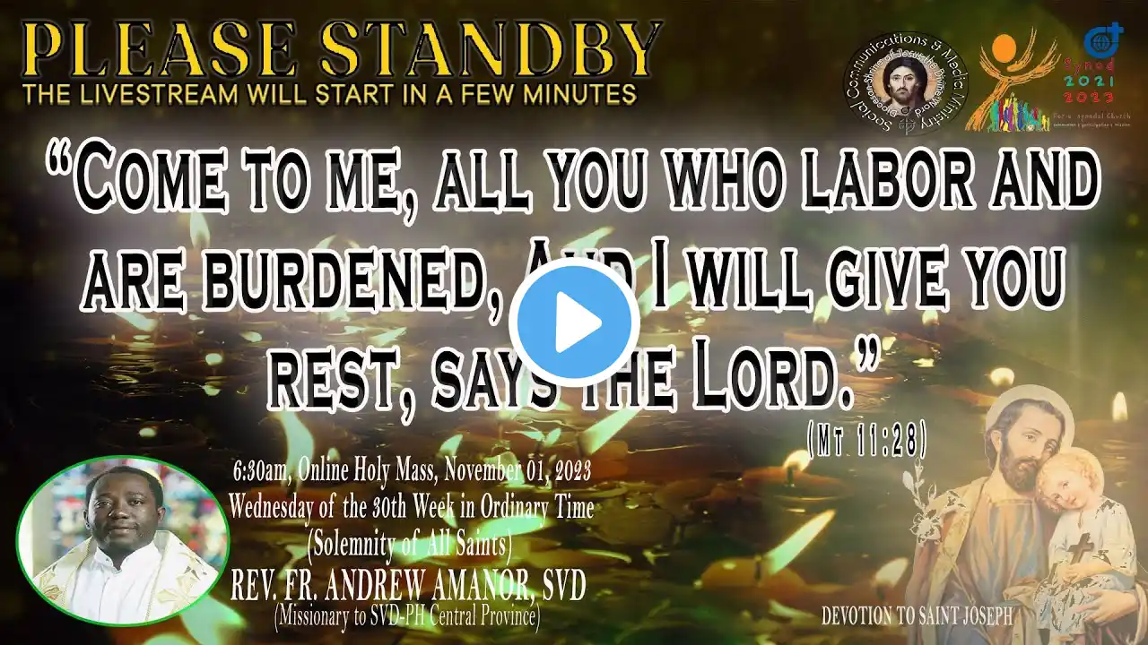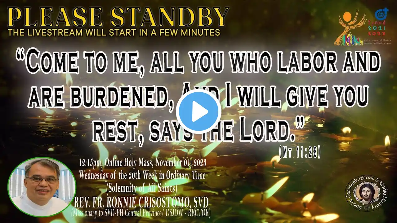 Live Now | Online Holy Mass & Devotion to Christ the King - 6:30am, Tuesday of the Thirty Fourth Week in Ordinary Time, November 28, 2023. This Holy Mass is celebrated via online and presided by the Rev. Fr. Louie Punzalan, SVD (Missionary to SVD-PH Central Province/ Alumni Affairs & External Relations) at the Diocesan Shrine of Jesus the Divine Word at Christ the King Mission Seminary, Quezon City. Reading: DN 2:31-45 Responsorial Psalm: PS DN 3:57, 58, 59, 60, 61 “Give glory and eternal praise to him.” Alleluia: REV 2:10C “Remain faithful until death, And I will give you the crown of life.” Gospel: LK 21:5-11 * For Mass Intentions: www.bit.ly/shrinemassintentions For Special Masses: www.bit.ly/specialonlinemass * This online mass/ video is available for your online participation in the Eucharist. You are invited to share the video with your family and friends. (ctto: To All Pictures/ Music/ Videos used - No Copyright Infringement Intended.) * May GOD bless you and your family always and in all ways! #LIVEmass #SVD #DSJDW #CtKMS #SVDmission #DivineWord #ThinkSVD #PromotionToLOVEtheWORDofGOD #WitnessToTheWord #ThinkMission #commitedToHISmission #DSJDWholymassLIVE #RootedInTheWORD #SVDonlineMass “May the darkness of sin and the night of unbelief vanish before the light of the word and the spirit of grace. And may the Heart of Jesus live in every heart! Amen.” (St. Arnold Janssen, 1837-1909) #NEWnormalAtTheShrine