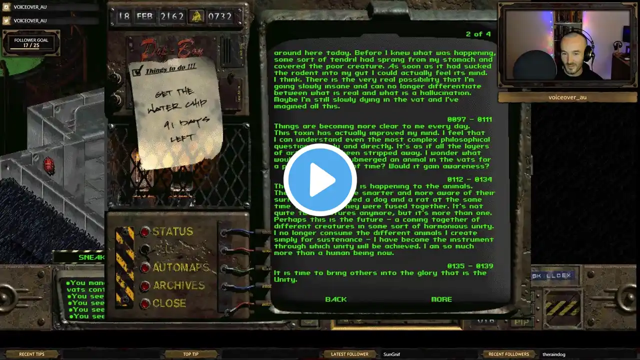 Log: Grey, Richard Source: Mariposa Military Base FEV vat control terminal Transcript: ==0000 - 0004== I'm dying. I need to get this down before the pain overwhelms me. ==0005 - 0020== I can't believe that I was finally able to drag myself out of that vat. The slime did not affect me, but I nearly drowned. I don't know what happened to Harold - he was standing right next to me when the crane knocked me into the vat. He must have been killed or he would have tried to help me. Francine is dead, killed by one of those robots. ==0021 - 0027== I have no idea how much time has passed. I was able to hack the computer to turn off the robots and record this, but now my mind is slipping away.There is much pain... ==0028 - 0043== The green slime that I was immersed in is the source of all the mutations we traced to here. My skin is starting to fester and peel. In other areas it is bubbling and is expelling a green mucus-like substance. Some days the pain is almost tolerable. ==0044 - 0057== I can actually walk a few steps again...It seems inconceivable that I dragged myself all the way up here from the vat room. Strangely, I'm actually feeling stronger, though I'm still in a lot of pain. Everything seems to be getting smaller. ==0058 - 0096== I think I consumed one of the mutated things scurrying around here today. Before I knew what was happening, some sort of tendril had sprang from my stomach and covered the poor creature. As soon as it had sucked the rodent into my gut I could actually feel its mind. I think. There is the very real possibility that I'm going slowly insane and can no longer differentiate between what is real and what is a hallucination. Maybe I'm still slowly dying in the vat and I've imagined all this. ==0097 - 0111== Things are becoming more clear to me every day. This toxin has actually improved my mind. I feel that I can understand even the most complex philosophical questions simply and directly. It's as if all the layers of artifice have been stripped away. I wonder what would happen if I submerged an animal in the vats for a prolonged period of time? Would it gain awareness? ==0112 - 0134== The strangest thing is happening to the animals. They actually become smarter and more aware of their surroundings. I dipped a dog and a rat at the same time today, and they were fused together. It's not quite two creatures anymore, but it's more than one. Perhaps this is the future - a coming together of different creatures in some sort of harmonious unity. I no longer consume the different animals I create simply for sustenance - I have become the instrument through which unity will be achieved. I am so much more than a human being now. ==0135 - 0139== It is time to bring others into the glory that is the Unity. ==0140 - 0153== A lost soul has finally strayed into my home. I was so surprised I consumed him before dipping, a mistake I shall not make again. His mind was so primitive as to be repulsive to my refined cognitive abilities. ==0154 - 0172== I've begun to modify myself to be more pleasing to the Unity by injecting small doses of the virus into my body. The slime in the vats is a man-made virus called the Forced Evolutionary Virus. This information was acquired from my newly grown neurolink with the base computer. ==0173 - 0198== The few wanderers that have found their way here have been a disappointment to me. They can't seem to mutate correctly. The best I've been able to create are some big and dumb mutants. Most can recall nothing from before I initiated them into the wondrous Unity. I only feed on them for fuel, now. Their minds are nothing to me. ==0199 - 0236== Oh glorious creator!! I have succeeded in spreading the complete joy of unification to another soul! Unlike the others, his total radiation count was low. I believe this is the factor we have been overlooking all this time, as it seems the conversion is more successful in the cases with less radiation damage. I have never known such glory as I felt when taking his mind into our own. ==0237 - 0281== We are beginning to create an army dedicated to unifying the wonderful diversity of life. We have trained them to continue our work here while we search out more populated areas to take into ourselves. We are beginning to feel the limitations of a body that is mobile. We must find a permanent home, with a greater store of knowledge, and a steady supply of bio-mass. ==0282 - 0303== We have stopped increasing ourself until we can find this new unification center. When we have arrived we will continue to grow and feed until we have brought peace and unity to the entire world. This video was made using ElevenLabs AI voice cloning TTS.