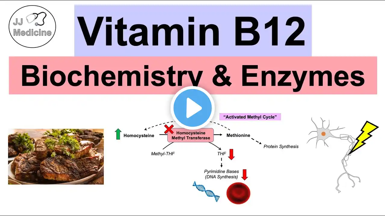 Vitamin B12 - Structure, Forms, Metabolism, Functions and Deficiency - This is the video on one of the important water soluble vitamin i.e Vitamin B12 with examples of theory questions and NEET PG MCQs. 00:00 - Introduction 00:47 - Examples of theory questions 01:21 - Synonyms of Vitamin B12 01:37 - Vitamin B12 Structure 02:58 - Forms of Vitamin B12 03:48 - Dietary Sources of Vitamin B12 04:28 - RDA of Vitamin B12 04:50 - Absorption , Transport and Storage of Vitamin B12 (Metabolism of Vitamin B12) 07:55 - Functions of Vitamin B12 08:21 - Conversion of methylmalonyl CoA to succinyl CoA 09:18 - Role of Vitamin B12 conversion of homocysteine to methionine (Folate Trap) 10:23 - Causes of Vitamin B12 Deficiency 12:09 - Deficiency Manifestations of Vitamin B12 12:53 - Subacute combined regeneration 15:36 - Assessment of Vitamin B12 Deficiency 15:52 - Schiilling Test 17:17 - NEET PG Biochemistry MCQs Cobalamin (Vitamin B12) Other names – extrinsic factor of castle and antipernicious anemia factor It is water soluble, heat stable and red in color It contains 4.35% cobalt by weight Structure Vitamin B12 bears a complex corrin ring (containing pyrrols similar to porphyrin), linked to a cobalt atom held in the center of the corrin ring, by four coordination bonds with the nitrogen of the pyrrole groups. Sources Dietary sources of vitamin B12 are of animal origin ; meat, eggs, milk, dairy products, fish, poultry, etc. Liver is the richest source. Curd is a good source, because lactobacillus can synthesize B12. Vitamin B12 is absent in plant foods. Humans obtain small amounts of B12 from intestinal flora. Nutritional Requirements (RDA ) Normal daily requirement is 1–2 μg/day. During pregnancy and lactation, this is increased to 2 μg/day. Those who take folic acid, should also take vitamin B12. Elderly people are advised to take vitamin B12 supplementation.. Functions There are only two human enzyme systems that are known to require vitamin B12 coenzyme. 1. Isomerization of methylmalonyl-CoA to succinyl-CoA 2. Conversion of homocysteine to methionine Subscribe my channel from - / biochemistrybasicsbydramit For more intersting stuffs related to biochemistry visit - https://www.biochemistrybasics.com/ Follow me On Twitter - / dr_biochemistry On Instagram - / biochemisrybasics On Facebook - / amit.v.m #vitaminB12 #cobalamin #biochemistry