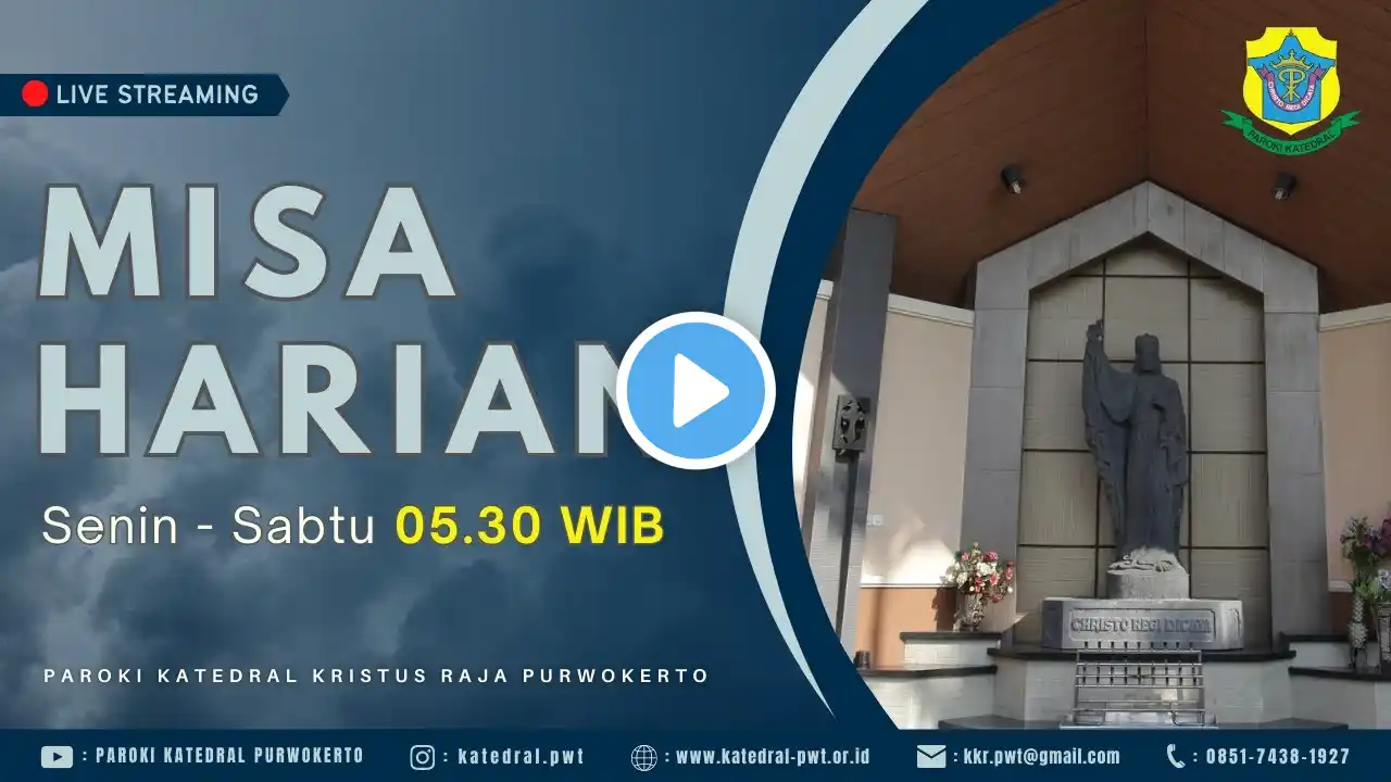 LAYANAN ROHANI LIVE STREAMING PAROKI KATEDRAL KRISTUS RAJA PURWOKERTO Perayaan Ekaristi Harian (kecuali Jumat Pertama DITIADAKAN Misa Pagi) Senin - Sabtu : 05.30 WIB Perayaan Ekaristi Jumat Pertama + Adorasi SMK Jumat awal bulan : 18.00 WIB Perayaan Ekaristi Mingguan Sabtu : 17.00 WIB Minggu : 06.00, 08.00 dan 17.00 WIB Completorium (Ibadat Penutup) Senin - Selasa - Kamis - Jumat : 21.00 WIB ---------------------------------------------------------------------------------- Paroki Katedral Kristus Raja Purwokerto Jl. Gereja No. 3 Purwokerto, Jawa Tengah, Indonesia Telp : (0281) 637052 WA Sekretariat / Ujub Misa : 085174381927 Website : www.katedral-pwt.or.id Email : [email protected] Instagram : @katedral.pwt Facebook : Kristus Raja Katedral Info lebih lanjut : www.linktr.ee/ParokiKatedralPurwokerto