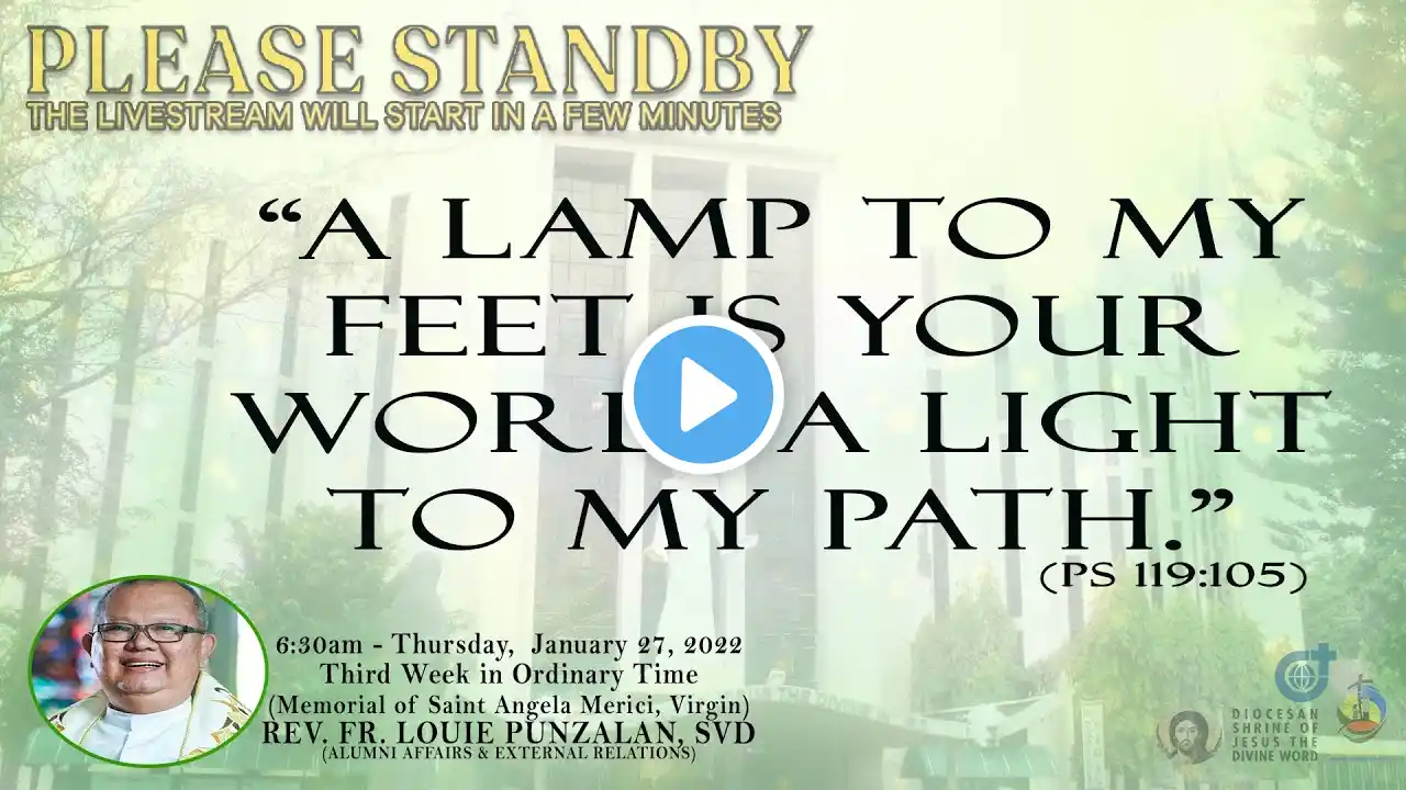 Live Now | Online Holy Mass - 6:30am, Thursday in the Third Week in Ordinary Time, January 27, 2022. (Memorial of Saint Angela Merici, Virgin) This Holy Mass is celebrated via online and presided by the Rev. Fr. Louie Punzalan, SVD (Alumni Affairs & External Relations) at the Diocesan Shrine of Jesus the Divine Word at Christ the King Mission Seminary, Quezon City. Reading: 2 SM 7:18-19, 24-29 Responsorial Psalm: PS 132:1-2, 3-5, 11, 12, 13-14 “The Lord God will give him the throne of David, his father.” Verse before the Gospel: PS 119:105 “A lamp to my feet is your word, a light to my path.” Gospel: MK 4:21-25 * For Mass Intentions: www.bit.ly/shrineintentions For Special Masses: www.bit.ly/specialonlinemass * This online mass/ video is available for your online participation in the Eucharist. You are invited to share the video with your family and friends. (ctto: To All Pictures/ Music/ Videos used - No Copyright Infringement Intended.) * May GOD bless you and your family always and in all ways! #LIVEmass #SVD #DSJDW #CtKMS #SVDmission #DivineWord #ThinkSVD #PromotionToLOVEtheWORDofGOD #WitnessToTheWord #ThinkMission #commitedToHISmission #DSJDWholymassLIVE #RootedInTheWORD #SVDonlineMass “May the darkness of sin and the night of unbelief vanish before the light of the word and the spirit of grace. And may the Heart of Jesus live in every heart! Amen.” (St. Arnold Janssen, 1837-1909) #NEWnormalAtTheShrine