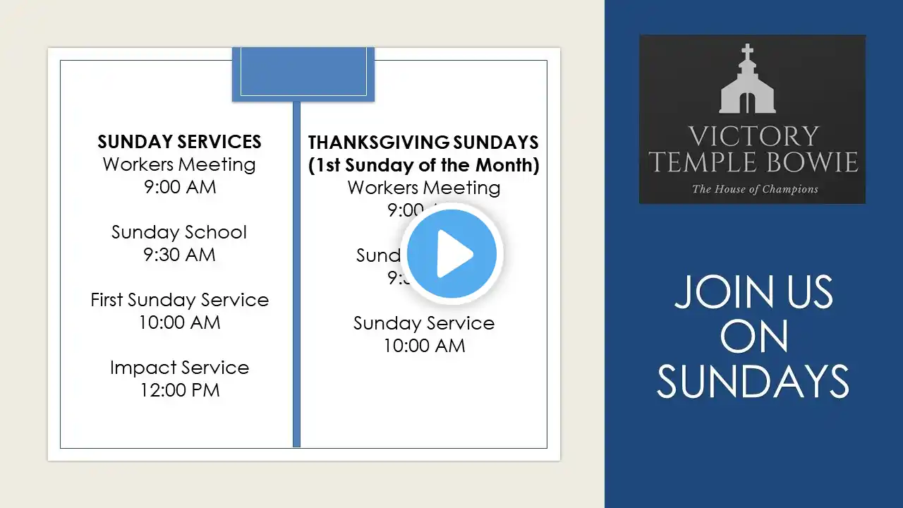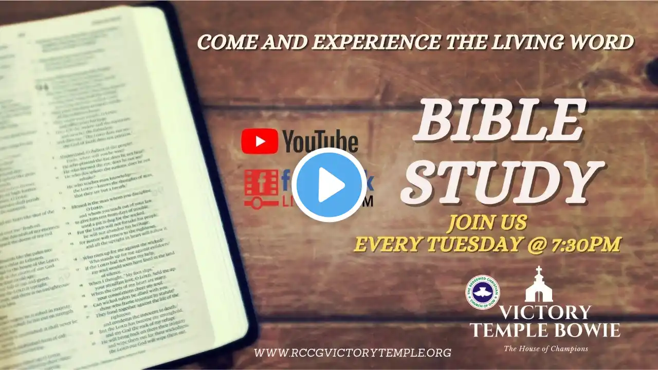 Hello Family, Thank you for joining us on this Special Tuesday as we have Bible study with RCCG General Overseer, Pastor E.A. Adeboye (Daddy G.O). May we all be blessed as we learn the undiluted word of God from God's servant. God bless you. Love, From Our Family to Yours Give your Life: https://victorytemple.ccbchurch.com/g... To Give Online: https://victorytemple.ccbchurch.com/g... Social Media: Instagram - / victorytemplebo. . Facebook - / rccgvictoryt. . Our Website - https://www.rccgvictorytemple.org/ VTB Channel - / rccgvictorytemplebowie RCCG Victory Temple Bowie The House of Champions Victory Temple does not have any right to the songs used.