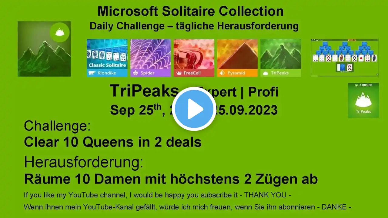 Goal: Clear 10 Queens in 2 deals Solution for expert TriPeaks - Microsoft Solitaire Collection\Daily Challenges 9/25/23 Complete solutions for Daily Challenges could be found here: • Daily Challenges of Microsoft Solitaire Co... Solutions for Microsoft Mahjong could be found here: • Microsoft Mahjong, Solutions for Daily Cha...
