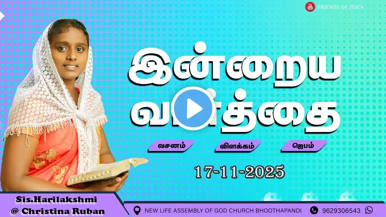 #tamilbibleverses #verseoftheday #indraiyavasanam #11october #11october2024 #11october2025 #todaybibleverseintamil #todaybibleverse #tamilbiblewords #promise #promiseverse #promiseword #promises #promiseday #promiseoftheday தினமும் அதிகாலையில் ஒரு வேத வசனமும், அதின் விளக்கமும், ஜெபமும் இந்த Channel'லில் ஒளிபரப்பப்படும்.. இந்த வேத வசனங்களை பார்த்து, வாசித்து, ஜெபித்து, நீங்கள் ஒவ்வெருநாளும் கிறிஸ்துவோடு நடக்க கர்த்தர் உங்களை அழைக்கிறார்.. தினமும் கர்த்தருக்கென்று, ஒரு குறைந்த பட்சம் பத்து நிமிடம் (10 mins) கொடுங்கள்! கர்த்தரை உங்கள் வாழ்க்கையில் முதலாவது வைப்பீர்களானால், உங்கள் வாழ்க்கையில் ஆசிர்வாதத்தை கர்த்தர் கொண்டு வருவார்! ஒவ்வரு நாளும் சரியாக அதிகாலையில் 4'மணிக்கு, இன்றைய வேத வசனம் ஒளிபரப்பப்படும்! - ஒவ்வொருவரும் இதை பார்த்து, ஆசிர்வாதத்தை பெற்றுக்கொள்ளும்படி அன்புடன் கேட்டுக்கொள்கிறேன்... ------------------------------------------------------------------------------------------------------------------------ Every morning a one bible verse, explanation for that verse and prayer will be broadcast on this channel. The Lord invite you to walk with Christ every day by hearing and reading this bible verse, and praying. Give at least ten minutes (10 minutes) to God every day! If you put the Lord first in your life, the Lord will bring blessings into your life! Every day exactly at 12 noon, today's Bible Verse will be broadcast! - Kindly request everyone to watch this and be blessed... #josephaldrin #pradhanaaasariyarae #mountzionchurch #tamilchristian #tamilchristianmessage #tamilchristianmessages #tamilchristianonline #tamilchristianmessageshort #sampchelladurai #jeevanchelladurai #aftchurch #aftchurchchennai #tamilchristiansongs #tamilchristianquotes #tamilchristianyouthnetwork #christianmessagelivetoday #christianmessagesintamil #christianmessages #christian #christianity #christianmotivation #dailybibleverse #dailybible #dailybibleverses #dailybiblewords #dailybiblereading #dailybiblequiz #dailytamilbibleverse #tamilbible #tamilbibleverse #tamilbiblewords #tamilbibleverses #tamilbiblecommentary #dailytamilbible #tamilbibleverseshorts #bibleverse #bibleverses #bibleverseoftheday #bibleversetoday #bibleversefortoday #bibleverseintamil #verseoftheday #verseofthedayintamil #verseofthedaybible #verseoftheweek #verseofday #tamilbibleversestamil #tamilbibleversetoday #tamilbibleverseoftheday #verses #todaybibleverse #todaybibleverseintamil #todaybiblewords #todaybibleversetamil #todaybiblereading #todaybibleverses #biblereading #bible #bibleverse #biblewords #biblemessage #tamilsermon #tamilsermons #tamilchristiansermon #tamilchristiansermons #tamilchristianworship #tamilchristiansong #tamilchristiancommunity #christianmessage #tamilchristiannetwork #mohanclazarus #mohanclazarusmessage #walkwithjesus For Prayer Requests - Email : [email protected] ///////////////////////////////////////////////////////////////////////////////////////////// Disclaimer : ⚡In this channel, I'm delivering spiritual messages and worships. I hope that you will be blessed when you guys listen to this. Just Preaching Gospel Words and glorifying god. 👉 Follow Us at : ☑️ Instagram: / delightyourselfinlord 👉 Please Subscribe to get more videos on time and share to everyone they too get bless & like & comment below on the comment section if you're blessed by this, "commenting below is just to know that, you guys are blessed and praising lord".