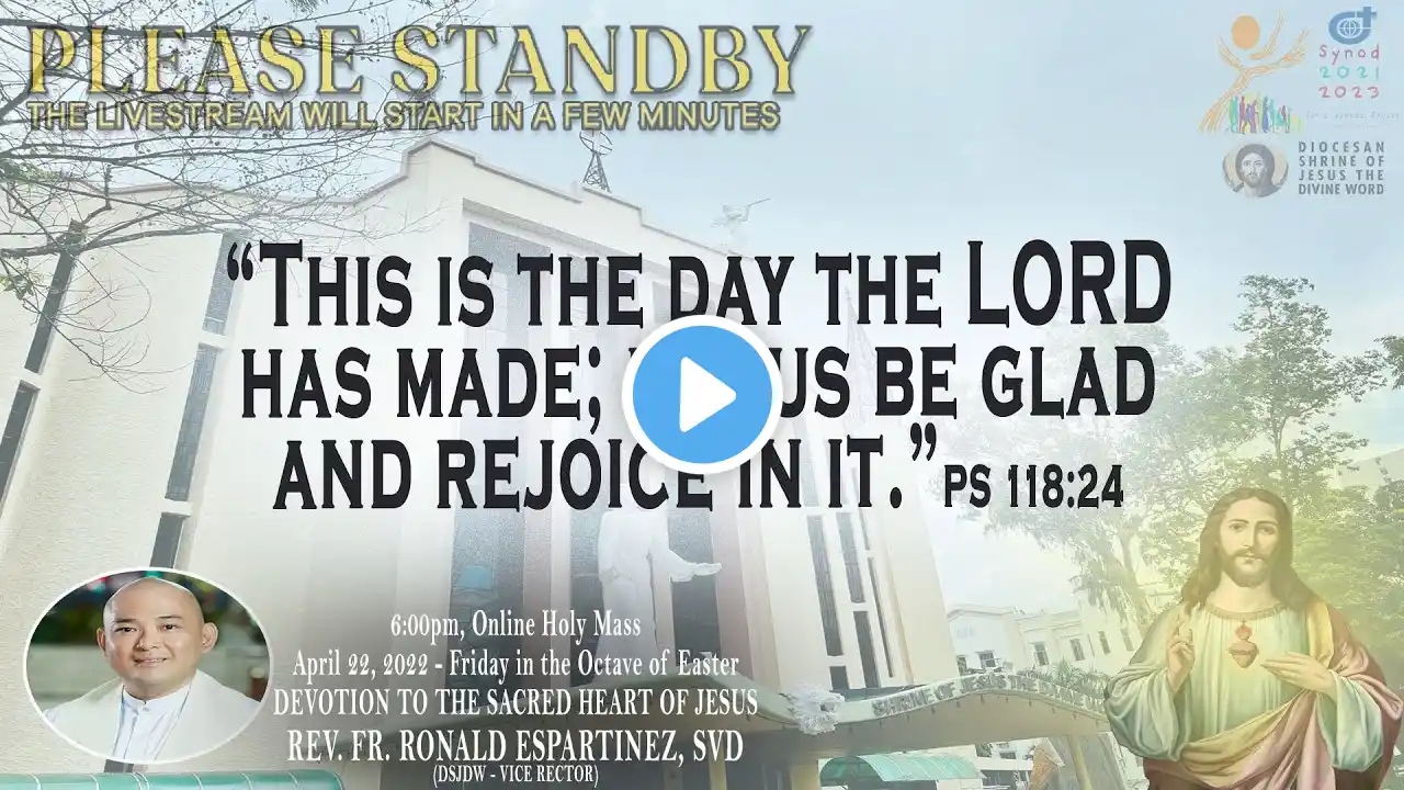 Live Now | Online Holy Mass & Devotion to Saint Jude Thaddeus - 6:00pm, Thursday in the Octave of Easter, April 21, 2022. This Holy Mass is celebrated via online and presided by the Rev. Fr. Isabelo San Luis, SVD (Radio & TV Ministry/ MCFI Director) at the Diocesan Shrine of Jesus the Divine Word at Christ the King Mission Seminary, Quezon City. Reading: ACTS 3:11-26 Responsorial Psalm: PS 8:2AB & 5, 6-7, 8-9 “O Lord, our God, how wonderful your name in all the earth!” Alleluia: PS 118:24 “This is the day the LORD has made; let us be glad and rejoice in it.” Gospel: LK 24:35-48 * For Mass Intentions: www.bit.ly/shrineintentions For Special Masses: www.bit.ly/specialonlinemass * This online mass/ video is available for your online participation in the Eucharist. You are invited to share the video with your family and friends. Watch/ Like/ Follow/ Share/ Subscribe to this channel for alerts and notifications on Daily Masses, Liturgical Services and other videos. (ctto: To All Pictures/ Music/ Videos used - No Copyright Infringement Intended.) * May GOD bless you and your family always and in all ways! #LIVEmass #SVD #DSJDW #CtKMS #SVDmission #DivineWord #ThinkSVD #PromotionToLOVEtheWORDofGOD #WitnessToTheWord #ThinkMission #commitedToHISmission #DSJDWholymassLIVE #RootedInTheWORD #SVDonlineMass #Easter2022 “May the darkness of sin and the night of unbelief vanish before the light of the word and the spirit of grace. And may the Heart of Jesus live in every heart! Amen.” (St. Arnold Janssen, 1837-1909) #NEWnormalAtTheShrine