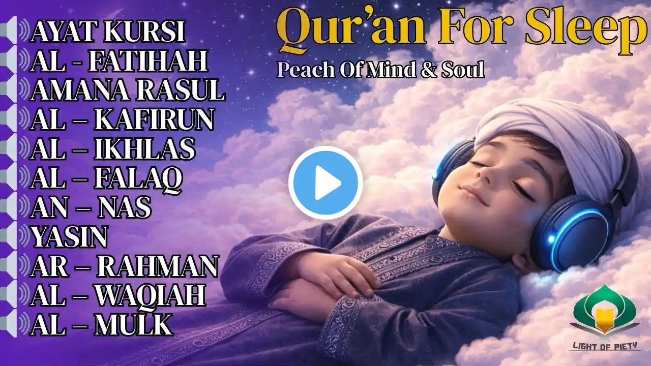 Relaxing Quran for Sleep & Healing | Soft Recitation for Calm Nights | The Light of Holy Quran Experience a peaceful and spiritually soothing night with this Quran for Sleep recitation by The Light of Holy Quran. This calming audio is created to help you overcome overthinking, anxiety, stress, and insomnia, leading your heart toward deep rest and emotional healing. The soft recitation brings tranquility, slows the mind, and creates the perfect atmosphere for sleep, meditation, or quiet reflection. This video includes beautiful recitations of Surah Yaseen, Surah Mulk, Surah Rahman, and Surah Waqiah, known for their blessings and healing effects. Listening to the Qur’an at night protects the heart, cleanses the mind, and brings comfort to the soul. Whether you are trying to fall asleep faster, reduce stress, find peace, or create a calming environment for your home, this recitation will guide you gently into relaxation. Let the soothing voice and peaceful ambience help you unwind after a long day. Close your eyes, breathe deeply, and allow the divine words of Allah to bring serenity to your night. quran for sleep relaxing quran deep sleep quran sleep healing quran quran for anxiety relief quran for depression quran for sleep, relaxing quran, sleep quran, quran healing, soft quran recitation, quran for stress relief, quran for anxiety, surah mulk sleep, surah rahman relaxing, peaceful quran, night quran, quran lofi, asmr quran, baby sleep quran, calm quran recitation 🔗 Watch More From The Light of Holy Quran • Soft Lofi Quran for Sleep | Calm Your Heart & Mind | The Light of Holy Quran – • Soft Lofi Quran for Sleep | Calm Your Hear... • Quran for Deep Sleep 😴 | Peaceful Night Recitation | The Light of Holy Quran– • Quran for Deep Sleep 😴 | Peaceful Night Re... • Beautiful Quran Recitation for Sleep Lofi I Ayatul Kursi, Yasin , Arrehman | The Light of Holy Quran – • Beautiful Quran Recitation for Sleep Lofi ... 💛 Subscribe for more peaceful Quran recitations 👍 Like the video to support Islamic content 💬 Comment which Surah you want in the next upload 🔁 Share this recitation with someone who needs peace tonight 📢 Hashtags #quranforsleep #relaxingquran #sleepquran #quranhealing #quranforanxiety #nightquran #surahmulk #surahrahman #calmingquran #quranrecitation
