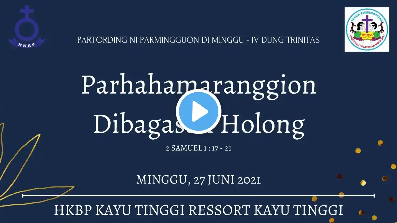 Syalom, selamat hari minggu. Tema : “Kasih Persaudaraan” Warta Jemaat selengkapnya dapat di unduh (download) di https://bit.ly/3qtQgjB Live Streaming Ibadah Minggu Siang 27 Juni 2021 menggunakan bahasa indonesia, ibadah dimulai pukul 09:30 WIB. Yang melayani : Khotbah Pdt. Hotman Simangunsong, S.Th Liturgis St. V. br. Siregar Warta Jemaat St. J. Lumban Raja Penerima Tamu - C.St. S. br. Manullang C.St. H. Sinaga Persembahan - St. D. R. br. Rajagukguk St. S. Simanjuntak St. T. P. Nainggolan St. H. M. Purba Koord.Persembahan - St. D. R. br. Rajagukguk P. Lonceng - St. S. Simbolon Organis - Ny. Gurning/br. Situngkir Song Leader - Ny. St. T. P. Nainggolan/br. Pangaribuan Ny. Rajagukguk/br. Bakkara Op. Multimedia Rini Butarbutar