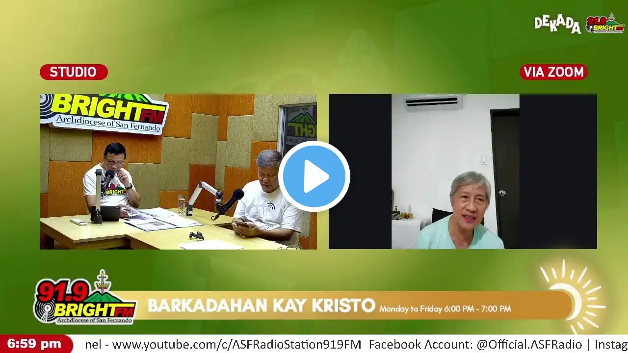 WATCH LIVE: Barkadahan Kay Kristo | October 03, 2025 (Friday) Gospel: Luke 10:13-16 Saint of the Day: St. Dionysius Song: “City of God” by Dan Schutte Host: Rev. Fr. Joseph Mary D. Bacay Cohosts: Bro. Iber Baltazar and Sis. Arlene David Textline Numbers: Smart | 0918-351-8282 Sun Cellular | 0942-357-4268 Subscribe to our Youtube Channel - / asfradiostation919fm Like and Share our Facebook Page - www.facebook.com/Official.ASFRadio Follow us on Twitter - @radio_asf Follow us on Instagram - @asfradios For Advertisements, you may send your inquiries - [email protected] or contact 0949-609-5478 For Donations - GCash ACCOUNT No. 0905-319-4871 Joseph Mary Bacay BPI ACCOUNT No. 8810 0120 49 RCASF 91.9 Bright FM BDO ACCOUNT No. 0062 9801 7632 THE ROMAN CATHOLIC ARCHBISHOP OF SAN FERNANDO