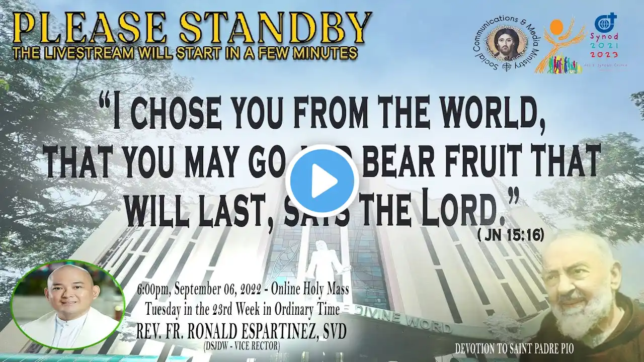 #SVDat147Anniversary Live Now | Online Holy Mass & Devotion to Saint Jude Thaddeus - 6:00pm, Thursday in the Twenty Second Week in Ordinary Time, September 01, 2022. This Holy Mass is celebrated via online and presided by the Rev. Fr. Isabelo San Luis, SVD (Radio & TV Ministry/ MCFI Director) at the Diocesan Shrine of Jesus the Divine Word at Christ the King Mission Seminary, Quezon City. Reading: 1 COR 3:18-23 Responsorial Psalm: PS 24:1BC-2, 3-4AB, 5-6 “To the Lord belongs the earth and all that fills it.” Alleluia: MT 4:19 “Come after me, says the Lord, and I will make you fishers of men.” Gospel: LK 5:1-11 * For Mass Intentions: www.bit.ly/shrineintentions For Special Masses: www.bit.ly/specialonlinemass * This online mass/ video is available for your online participation in the Eucharist. You are invited to share the video with your family and friends. Watch/ Like/ Follow/ Share/ Subscribe to this channel for alerts and notifications on Daily Masses, Liturgical Services and other videos. (ctto: To All Pictures/ Music/ Videos used - No Copyright Infringement Intended.) * May GOD bless you and your family always and in all ways! #LIVEmass #SVD #DSJDW #CtKMS #SVDmission #DivineWord #ThinkSVD #PromotionToLOVEtheWORDofGOD #WitnessToTheWord #ThinkMission #commitedToHISmission #DSJDWholymassLIVE #RootedInTheWORD #SVDonlineMass “May the darkness of sin and the night of unbelief vanish before the light of the word and the spirit of grace. And may the Heart of Jesus live in every heart! Amen.” (St. Arnold Janssen, 1837-1909) #NEWnormalAtTheShrine