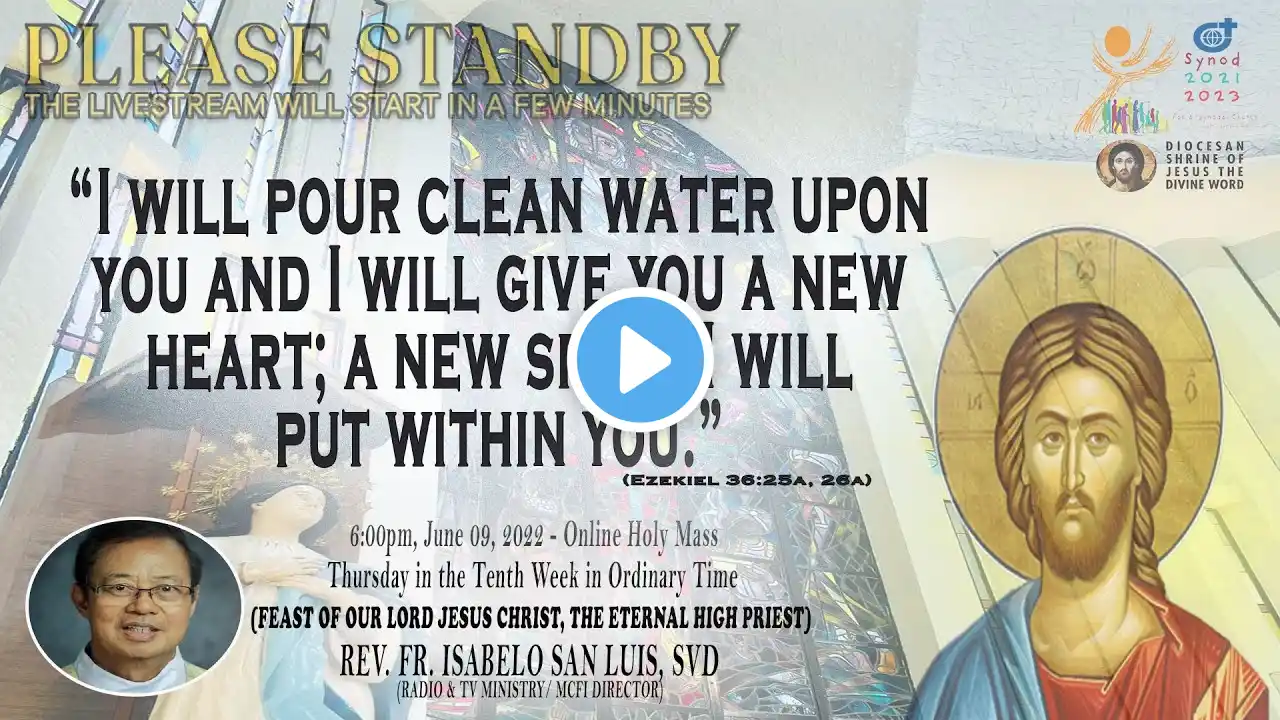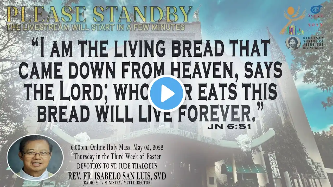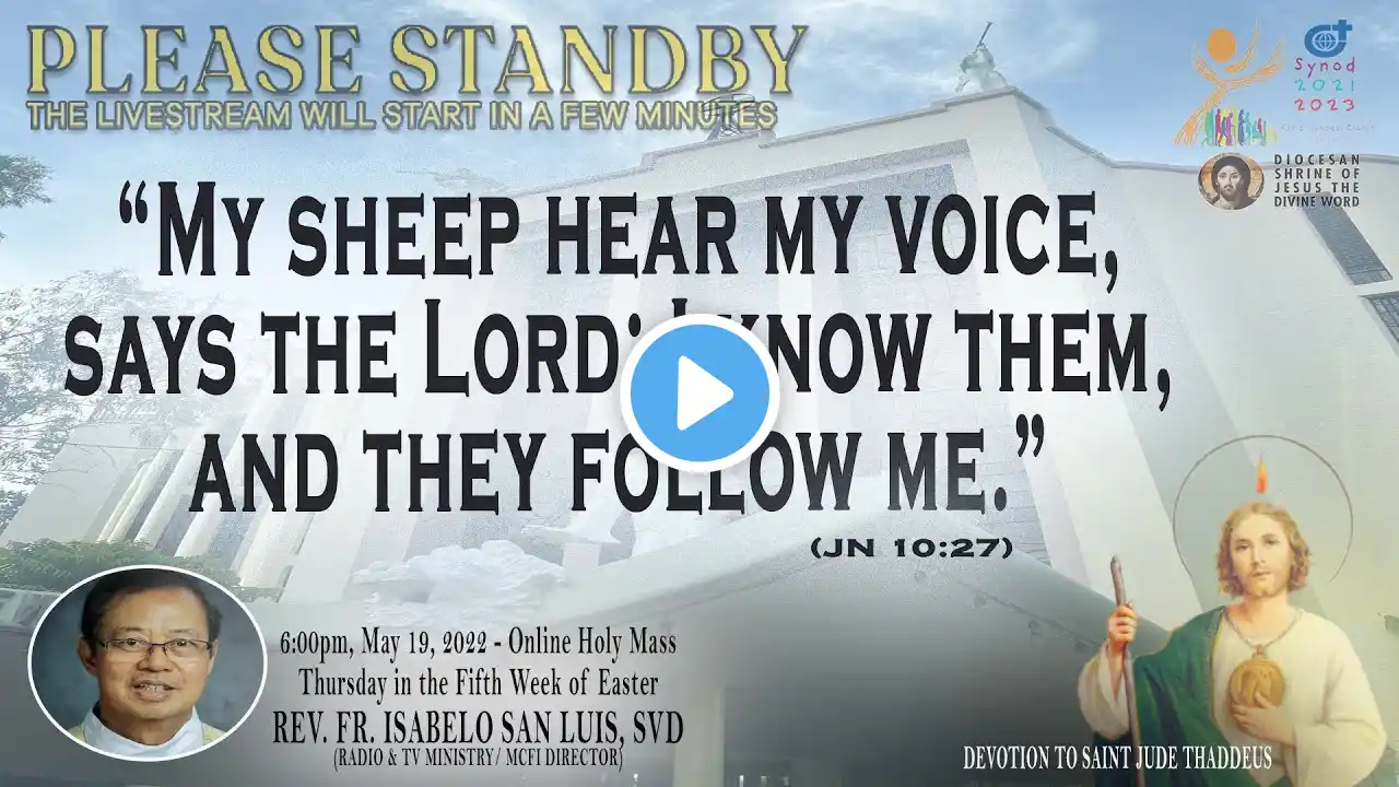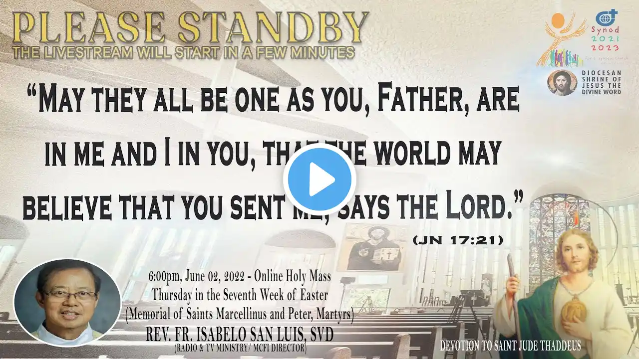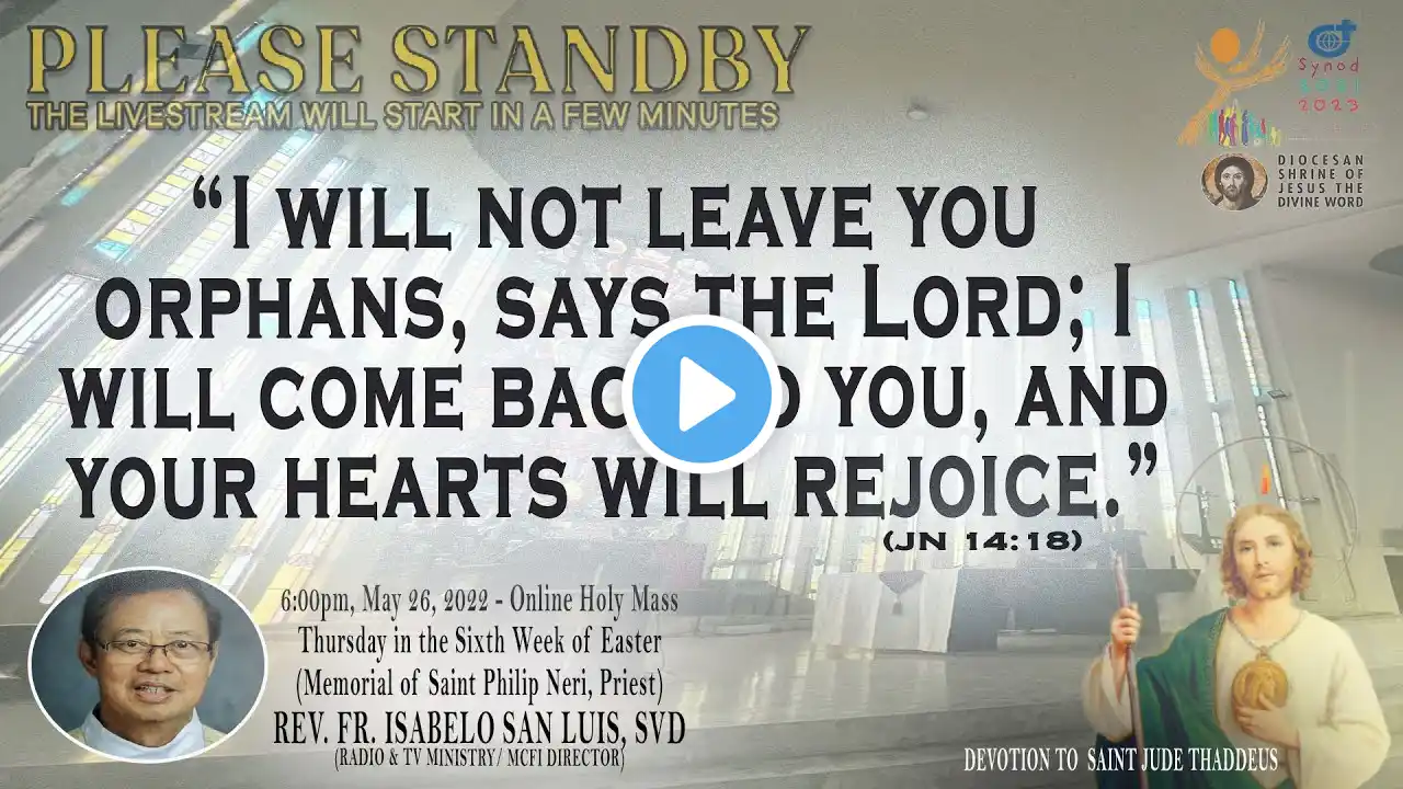 Live Now | Online Holy Mass & Devotion to Saint Jude Thaddeus - 6:00pm, Thursday in the Sixth Week of Easter, May 26, 2022. (Memorial of Saint Philip Neri, Priest) This Holy Mass is celebrated via online and presided by the Rev. Fr. Isabelo San Luis, SVD (Radio & TV Ministry/ MCFI Director) at the Diocesan Shrine of Jesus the Divine Word at Christ the King Mission Seminary, Quezon City. Reading: ACTS 18:1-8 Responsorial Psalm: PS 98:1, 2-3AB, 3CD-4 “The Lord has revealed to the nations his saving power.” Alleluia: JN 14:18 “I will not leave you orphans, says the Lord; I will come back to you, and your hearts s will rejoice.” Gospel: JN 16:16-20 * For Mass Intentions: www.bit.ly/shrineintentions For Special Masses: www.bit.ly/specialonlinemass * This online mass/ video is available for your online participation in the Eucharist. You are invited to share the video with your family and friends. Watch/ Like/ Follow/ Share/ Subscribe to this channel for alerts and notifications on Daily Masses, Liturgical Services and other videos. (ctto: To All Pictures/ Music/ Videos used - No Copyright Infringement Intended.) * May GOD bless you and your family always and in all ways! #LIVEmass #SVD #DSJDW #CtKMS #SVDmission #DivineWord #ThinkSVD #PromotionToLOVEtheWORDofGOD #WitnessToTheWord #ThinkMission #commitedToHISmission #DSJDWholymassLIVE #RootedInTheWORD #SVDonlineMass “May the darkness of sin and the night of unbelief vanish before the light of the word and the spirit of grace. And may the Heart of Jesus live in every heart! Amen.” (St. Arnold Janssen, 1837-1909) #NEWnormalAtTheShrine