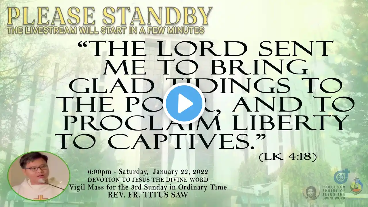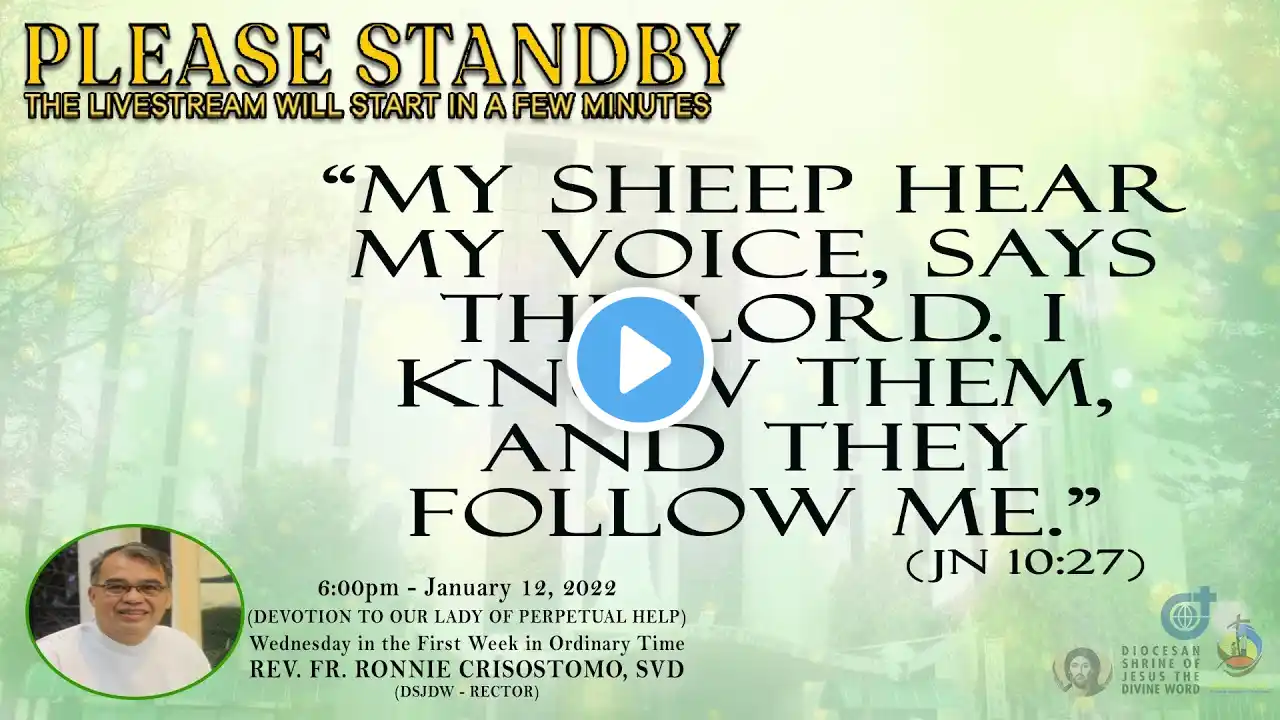 Live Now | Online Holy Mass & Devotion to Our Lady of Perpetual Help - 6:00pm, Wednesday in the First Week in Ordinary Time, January 12, 2022. This Holy Mass is celebrated via online and presided by the Rev. Fr. Ronnie Crisostomo, SVD (DSJDW - Rector) at the Diocesan Shrine of Jesus the Divine Word at Christ the King Mission Seminary, Quezon City. Reading: 1 SM 3:1-10, 19-20 Responsorial Psalm: PS 40:2 & 5, 7-8A, 8B-9, 10 “Here am I, Lord; I come to do your will.” Verse before the Gospel: JN 10:27 “My sheep hear my voice, says the Lord. I know them, and they follow me.” Gospel: MK 1:29-39 * For Mass Intentions: www.bit.ly/shrineintentions For Special Masses: www.bit.ly/specialonlinemass * This online mass/ video is available for your online participation in the Eucharist. You are invited to share the video with your family and friends. Watch/ Like/ Follow/ Share/ Subscribe to this channel for alerts and notifications on Daily Masses, Liturgical Services and other videos. (ctto: To All Pictures/ Music/ Videos used - No Copyright Infringement Intended.) * May GOD bless you and your family always and in all ways! #LIVEmass #SVD #DSJDW #CtKMS #SVDmission #DivineWord #ThinkSVD #PromotionToLOVEtheWORDofGOD #WitnessToTheWord #ThinkMission #commitedToHISmission #DSJDWholymassLIVE #RootedInTheWORD #SVDonlineMass “May the darkness of sin and the night of unbelief vanish before the light of the word and the spirit of grace. And may the Heart of Jesus live in every heart! Amen.” (St. Arnold Janssen, 1837-1909) #NEWnormalAtTheShrine