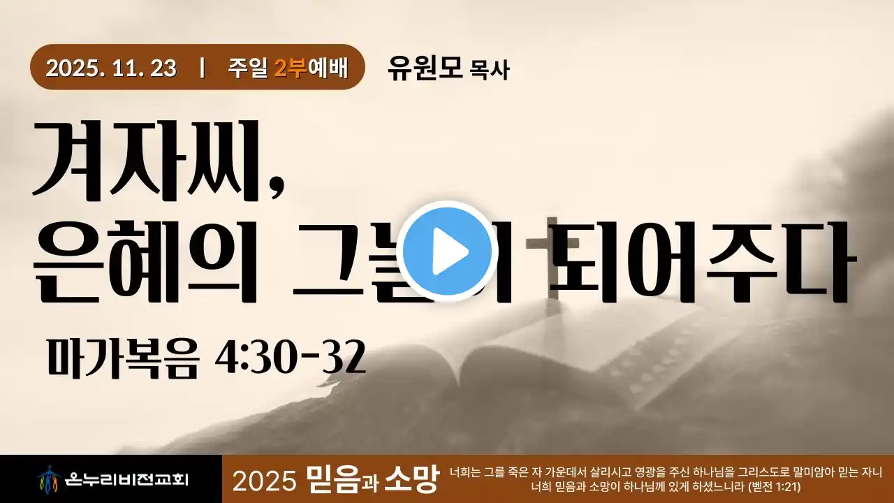주일3부예배(청년부) 𝑽𝒊𝒔𝒊𝒐𝒏 𝑾𝒐𝒓𝒔𝒉𝒊𝒑 2025 믿음과 소망 너희는 그를 죽은 자 가운데서 살리시고 영광을 주신 하나님을 그리스도로 말미암아 믿는 자니 너희 믿음과 소망이 하나님께 있게 하셨느니라 (벧전 1:21) --------------------------------------------- 🎧 𝑽𝒊𝒔𝒊𝒐𝒏 𝑾𝒐𝒓𝒔𝒉𝒊𝒑 찬양 순서 1. 태산을 넘어 험곡에 가도 2. 주님 큰 영광 받으소서 3. 내가 소망하는 아버지 나라 --------------------------------------------- 🎼 𝑽𝒊𝒔𝒊𝒐𝒏 𝑾𝒐𝒓𝒔𝒉𝒊𝒑 BAND Worship Leader | 양현아 Piano | 김서인 Aux Keys | 곽예빈 Drums | 박승민 B. Guitar | 오현욱 E. Guitar | 조현준 🎥 𝑽𝒊𝒔𝒊𝒐𝒏 𝑾𝒐𝒓𝒔𝒉𝒊𝒑 STAFF FOH Engineer | 김진식 Video Director | 김진솔 Subtitle Manager | 소민영 ✨ 예배 장소: 3층 본당 📍 교회 위치: 수원 온누리비전교회 #온누리비전교회 #주일예배 #주일3부예배 #청년부 #박두환목사 #VisionWorship #태산을넘어험곡에가도 #주님큰영광받으소서 #내가소망하는아버지나라 ▬▬▬▬▬▬▬▬▬▬▬▬▬▬▬▬▬▬▬▬▬▬▬▬▬▬▬▬▬▬▬ 🔗 온누리비전교회 홈페이지 http://www.onnurivision.org/ 🔗 온누리비전교회 유튜브 / @온누리비전 📖 설교 제목: 사적 신앙의 부정 📖 성경 구절: 고린도전서 15장 12-34절 📖 설교자: 박두환 목사 ▬▬▬▬▬▬▬▬▬▬▬▬▬▬▬▬▬▬▬▬▬▬▬▬▬▬▬▬▬▬▬ --------------------------------------------- 현재 저희 교회(온누리비전교회)는 온/오프라인 예배로 진행 중입니다. 예배 참석하기 원하시는 분은 아래 연락처로 문의 부탁 드립니다. ☎️ 연락처: 031-204-9686 📝 주소: 경기도 수원시 영통구 매영로 219-13(수원 온누리비전교회) 🔗 http://onnurivision.org/Page/Index/23 --------------------------------------------- 🕯️ 온누리비전교회 헌금안내 헌금 : [신한] 100-025-158551 OHM(선교) : 100-025-158529 🔔 이 영상에서 재생되는 광고는 온누리비전교회와 무관하며, 사용된 음악 저작권 등에 의해 자동으로 생성된 것입니다.