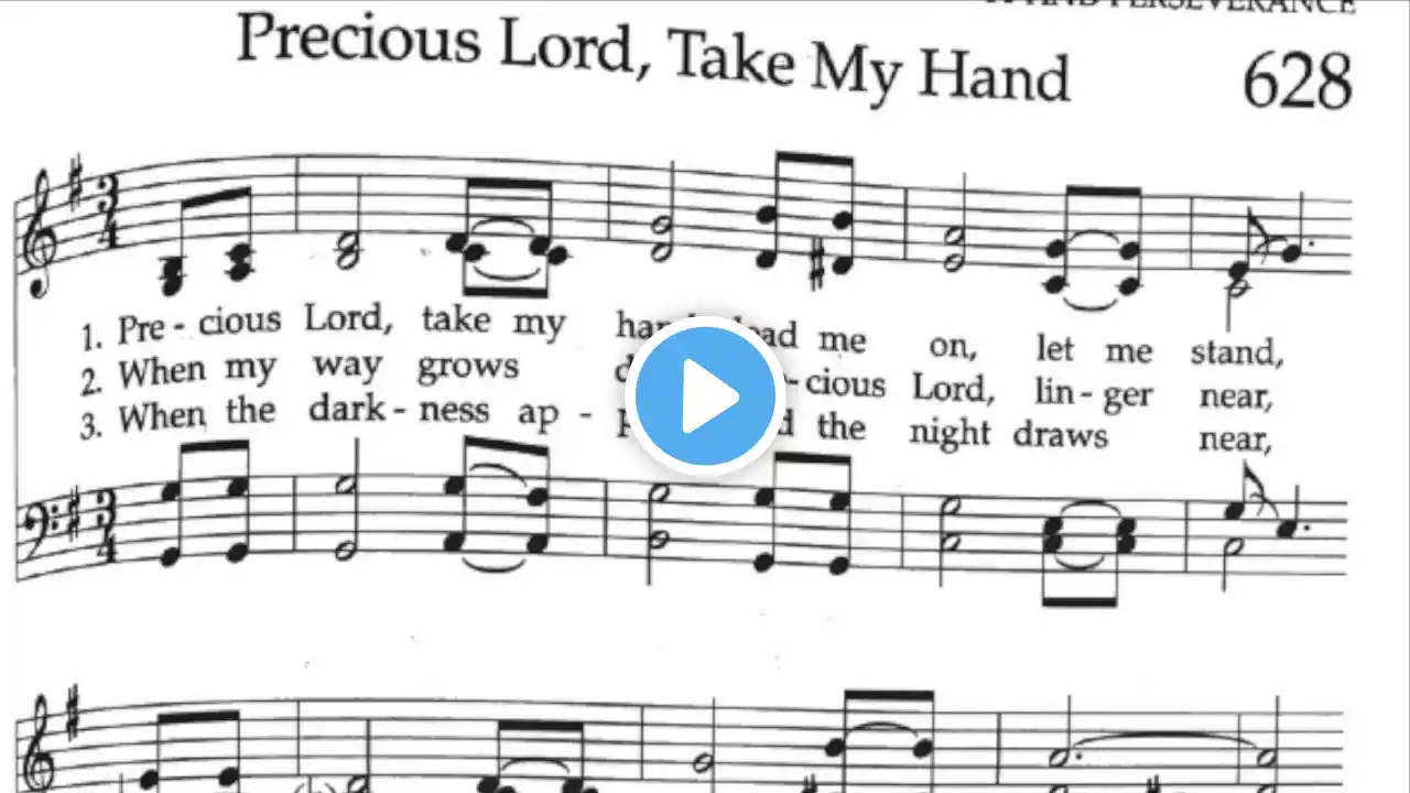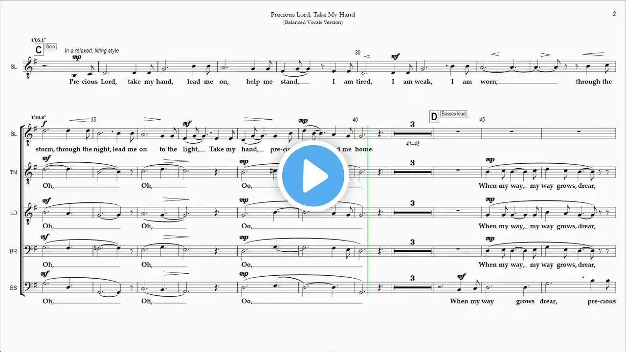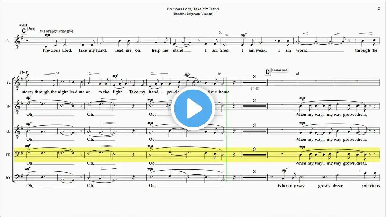 Rehearsal Instructions: The Full Playlist for "Precious Lord, Take My Hand" (hover mouse over score at any point during this video and click on "i" icon in upper right corner to view) contains 5 Videos - 4 for the Individual Vocal Parts and and 1 with all the Vocal Parts balanced together as sung in a performance. Each Video in the Playlist is divided into Rehearsal Sections (called "Chapters" in YouTube), viewed by moving your mouse cursor along the Video Playback line. Rehearsal Section Titles are displayed above the mouse cursor. You can rehearse a section multiple times in sequence by clicking at the beginning of section on the playline. Also, in Default View, if you click on the Chapter Title, below the playline next to the Time Display, snapshots of all the chapters will be displayed in a "Chapters" window next to the video. You can, then, easily select a Rehearsal Section ("Chapter") for practicing. "Emphasis ..." videos in the playlist present the song with a specific vocal part emphasized by a yellow highlight on the emphasized vocal track and the assigned vocal part is "sung" at a higher volume than the other parts which are heard in the background. In both Balanced and Emphasis versions, vocal parts are panned within the audio spectrum so they can be heard separately in a stereo setting, e.g. headphones or speakers. You can quickly learn your assigned vocal part by practicing with the Emphasis version and then testing yourself with the Balanced version This website is an independent, unaffiliated rehearsal tool for choir members to learn their parts for a song. "Precious Lord, Take My Hand" is based on the published version of Hope Publishing Company in the "Singing Men 2" compilation. Precious Lord, Take My Hand Time Section/Title 0:00 A 0:36 B Acapella 0:57 C Solo 1:48 D Basses lead 1:58 E All Unison 3:06 F Harmony 3:29 G Conclusion