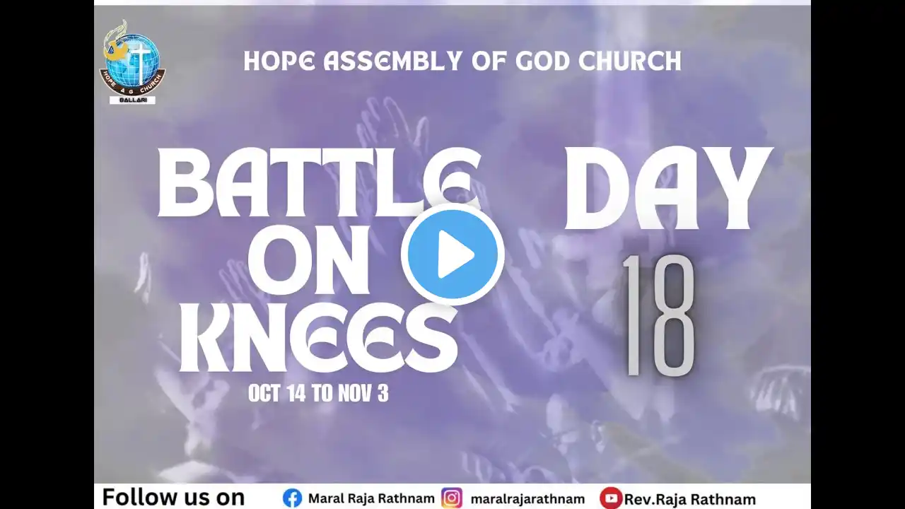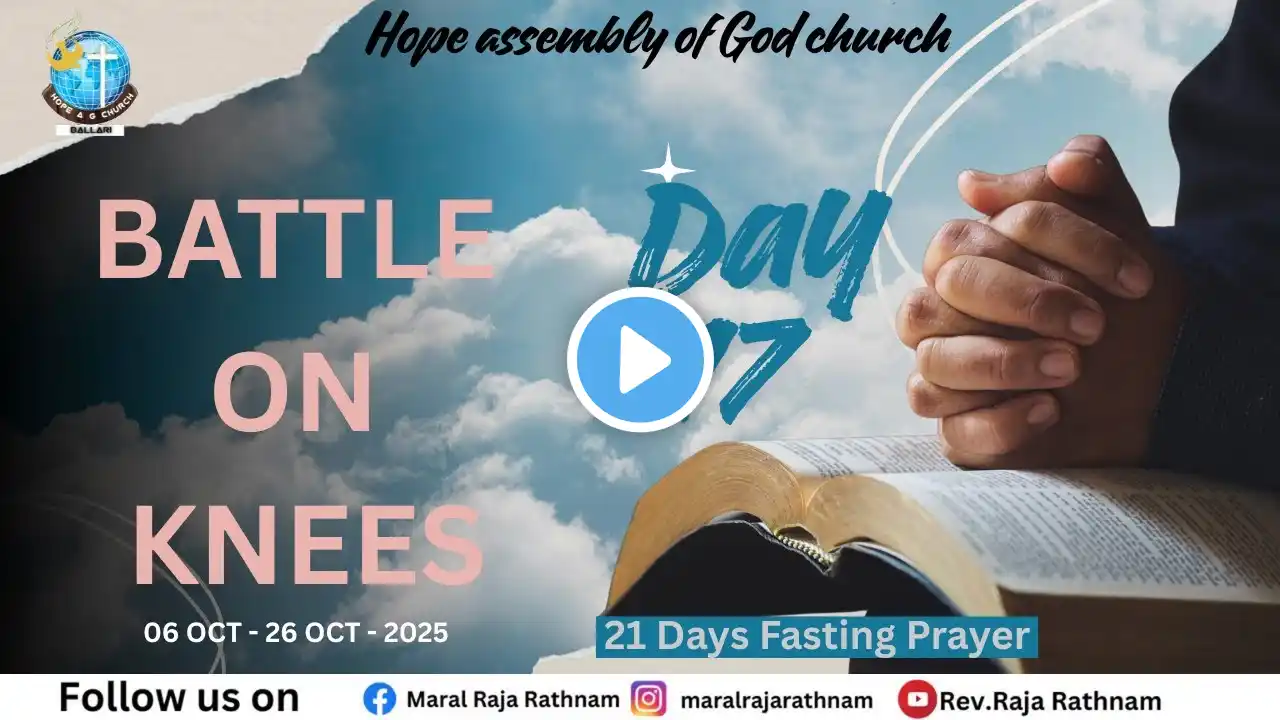 #worshiptime #worshipservicebellary #worshipinkannada #hopeagchurchballari #hope #religiouspractices #live #21daysfastingprayer #battleonknees #fastingprayer #hopeagchurchballari #revnsampathkumar #rajarathnam #worshiptime #hopeagchurchballari #liveworshipservice #praiseandworshipservice #kannadachurchlive #Worshiptime #ballarichurchlive #hopeagchurch #liveworship #blessedworship BATTLE ON KNEES 🔥🔥 26-10-2024 DAY- 21 OF 21 DAYS FASTING PRAYER FESTIVALS 🔥 We encourage you to join this fasting prayer festival 🙏 and be blessed COME LET US FIGHT OUR BATTLES ON OUR KNEES, In JESUS name 🔥 Glory to JESUS alone ❤ #GOD_BLESS_YOU_ALL For Prayer request Contact us @ Contact No - 9480400092 / 9945798454 Join us as we explore the significance of the Fasting Prayer Festival starting today in Ballari. This highly anticipated event is expected to bring together people from all walks of life, united in their devotion and faith. Get an insider's look at the preparations, ceremonies, and spiritual activities that make this festival so unique. Discover the history and cultural importance of this sacred occasion and experience the power of collective prayer and fasting. Stay tuned for updates, insights, and reflections on this extraordinary event. "No copyright infringement intended"