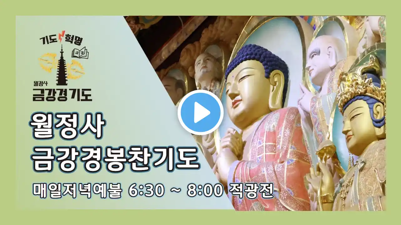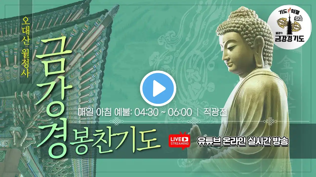 *** 오대산 월정사 금강경봉찬기도 *** 입 재 : 365일 매일 매일 입재 동참금 : 일반 : 10만원, 설판 : 30만원 문 의 : 기도신행국 033)339-6791~2 (당일 기도 접수 가능) 온라인 기도 : 매일 새벽 4:30~6:00, 저녁 6:30~8:00 *** 철야정진법회 : 매달 2째주 토요일 저녁 7시 / 적광전 & 문수선원 대승불교의 대표 경전인 금강반야바라밀경의 금강경봉찬기도에 동참하시어, 온갖 번뇌를 소멸하고 깨달음의 언덕으로 나아가는 인연을 만들어 가시길 바랍니다. 🙏🙏🙏 / 오대산월정사 멤버십 가입을 하실 수 있습니다. #정념스님 #월정사 #오대산 #자현스님 #금강경 #천수경 #반야심경 #법화경 #화엄경 #신묘장구대다라니 #기도 #소원성취 #소원성취기도 #부처 #부처님 #깨달음 #성불 #열반 #석가모니불 #석가모니 #염불 #기도 #명상 #요가 #행복 #전나무숲길 #강원도 #계곡 #등산 #봄 #개나리 #진달래 #벚꽃