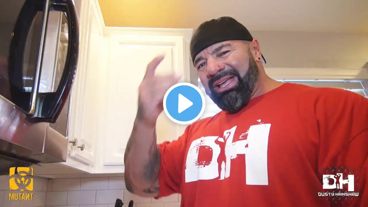 Filmed just 5 days before Dusty's 4-week coma, Dusty had recently started a customized off-season meal plan designed by Jordan Peters, Trained by JP . This is meal #2 of the day and includes: 10g Grass Fed Butter 250g 93/7 Ground Sirloin 100g Pasta Lots of Vodka Spaghetti Sauce 100g Pineapple