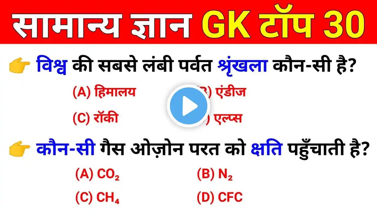 सामान्य ज्ञान | General Knowledge | Top 30 GK/GS questions | SSC GD, MTS, RPF, CRPF | GK quiz
