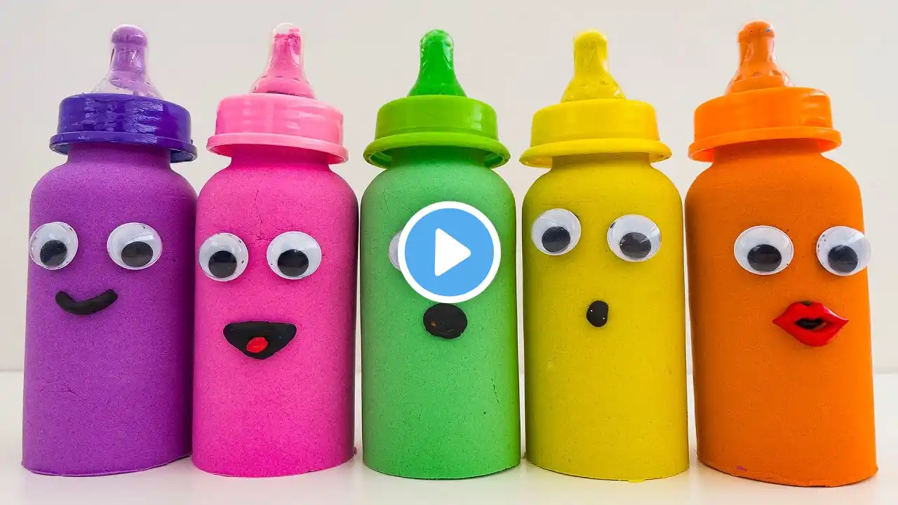 Match Rainbow Colors Squishy Balls with Kinetic Sand Milk Bottles Smiley Face | video for kids