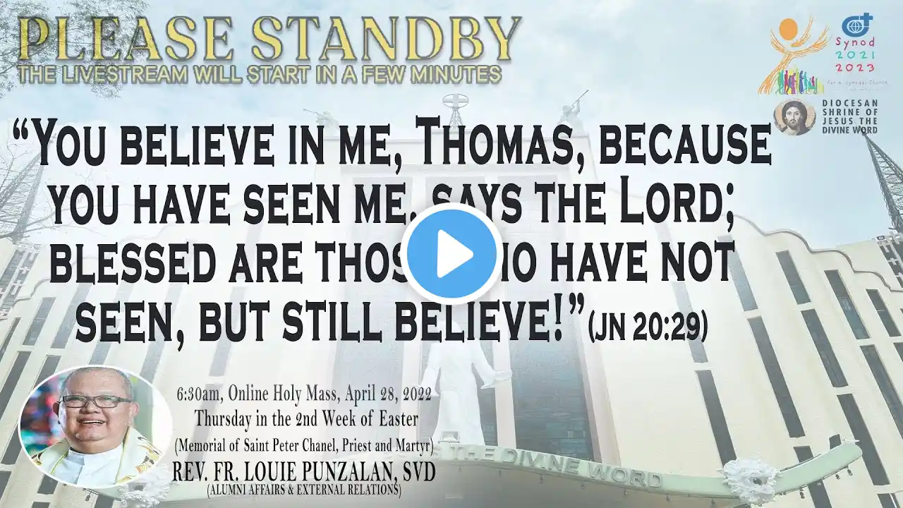 Live Now | Online Holy Mass - 6:30am, Thursday in the Second Week of Easter, April 28, 2022. (Memorial of Saint Peter Chanel, Priest and Martyr) This Holy Mass is celebrated via online and presided by the Rev. Fr. Louie Punzalan, SVD (Alumni Affairs & External Relations) at the Diocesan Shrine of Jesus the Divine Word at Christ the King Mission Seminary, Quezon City. Reading: ACTS 5:27-33 Responsorial Psalm: PS 34:2 & 9, 17-18, 19-20 “The Lord hears the cry of the poor.” Alleluia: JN 20:29 “You believe in me, Thomas, because you have seen me, says the Lord; blessed are those who have not seen, but still believe!” Gospel: JN 3:31-36 * For Mass Intentions: www.bit.ly/shrineintentions For Special Masses: www.bit.ly/specialonlinemass * This online mass/ video is available for your online participation in the Eucharist. You are invited to share the video with your family and friends. (ctto: To All Pictures/ Music/ Videos used - No Copyright Infringement Intended.) * May GOD bless you and your family always and in all ways! #LIVEmass #SVD #DSJDW #CtKMS #SVDmission #DivineWord #ThinkSVD #PromotionToLOVEtheWORDofGOD #WitnessToTheWord #ThinkMission #commitedToHISmission #DSJDWholymassLIVE #RootedInTheWORD #SVDonlineMass “May the darkness of sin and the night of unbelief vanish before the light of the word and the spirit of grace. And may the Heart of Jesus live in every heart! Amen.” (St. Arnold Janssen, 1837-1909) #NEWnormalAtTheShrine