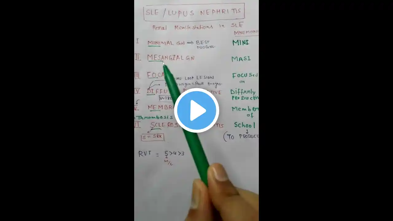The diagnosis of LN is ideally confirmed by a kidney biopsy. A kidney biopsy is important to define the nature of kidney involvement, exclude other causes of kidney injury, and determine the histopathologic subtype of LN. Biopsies are also important to assess disease activity and chronicity. For more Renal and Electrolyte Problems Mnemonics: • Renal and Electrolyte Problems Mnemonics #USMLEStep1 #Nephrology . Join us for more Mnemonics: / @medsurvivalmnemonics ► USMLE Step 1 mnemonics: • Mnemonic for Interleukins 1-8 Functions ► USMLE Step 2CK mnemonics: • Modified Duke's Criteria Mnemonic | Major ... ► USMLE Step 2 CS mnemonics: • Causes of Shortness of Breath Mnemonic | H... ► USMLE Step 3 mnemonics: • Modified Duke's Criteria Mnemonic | Major ... #medicalmnemonics #medicalstudent #medstudent #medical #medicine #medicalknowledge #Medsurvival #medicalknowledge #science #nursingstudent #usmlemnemonics #usmlepreparation #abim #nclex #fcpspart1 #fcps #mrcp #comlex 💡 Stay ahead with medical mnemonics and study tips: • WhatsApp: bit.ly/MedSurvivalRaza • X (Twitter): bit.ly/MedSurvival • Facebook: bit.ly/Medsurvival