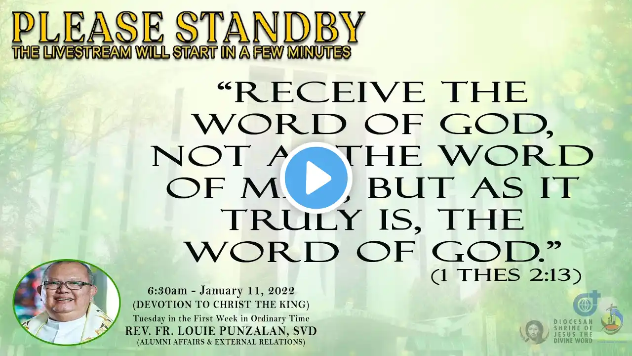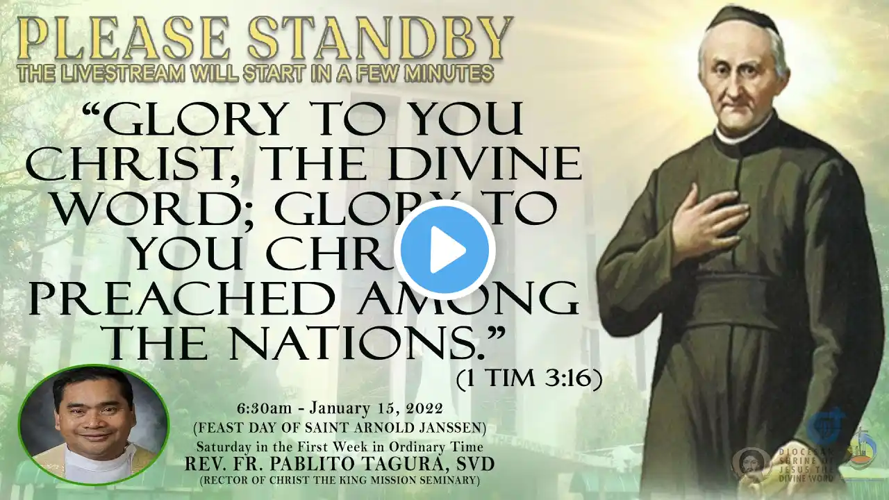 Live Now | Online Holy Mass - 6:30am, Saturday in the First Week in Ordinary Time, January 15, 2022. (Feast Day of Saint Arnold Janssen, Priest and Founder of the Society of the Divine Word) This Holy Mass is celebrated via online and presided by the Rev. Fr. Pablito Tagura, SVD (CtKMS - Dean of Studies/ Rector) at the Diocesan Shrine of Jesus the Divine Word at Christ the King Mission Seminary, Quezon City. First Reading: Isaiah 52:7-10 Responsorial Psalm: Ps 96:1-2a. 2b-3. 7-8a. 9-10a: Matt 28:19 “Proclaim the marvels of God among all peoples.” Or “Go and make disciples of all the nations.” Second Reading: Ephesians 3:8-12, 14-19 Verse before the Gospel: 1 Timothy 3:16 “Glory to you Christ, the Divine Word; glory to you Christ, preached among the nations.” Gospel: John 1:1-5, 9-14, 16-18 * For Mass Intentions: www.bit.ly/shrineintentions For Special Masses: www.bit.ly/specialonlinemass * This online mass/ video is available for your online participation in the Eucharist. You are invited to share the video with your family and friends. (ctto: To All Pictures/ Music/ Videos used - No Copyright Infringement Intended.) * May GOD bless you and your family always and in all ways! #LIVEmass #SVD #DSJDW #CtKMS #SVDmission #DivineWord #ThinkSVD #PromotionToLOVEtheWORDofGOD #WitnessToTheWord #ThinkMission #commitedToHISmission #DSJDWholymassLIVE #RootedInTheWORD #SVDonlineMass “May the darkness of sin and the night of unbelief vanish before the light of the word and the spirit of grace. And may the Heart of Jesus live in every heart! Amen.” (St. Arnold Janssen, 1837-1909) #NEWnormalAtTheShrine