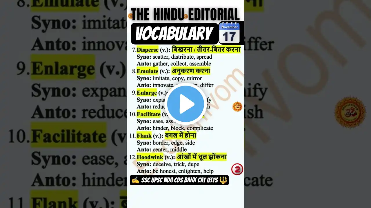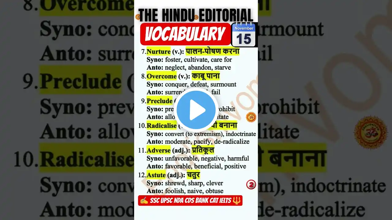 🔥 Master 6 Advanced Words from The Hindu Editorial 18 November 2025 Editorial Vocabulary List 💬 With Hindi meanings, synonyms & antonyms — perfect for UPSC, SSC, Bank, CAT, IELTS & Spoken English fluency! 👨🏫 Learn with Jimmy Bhadauriya (@Englishivom) – Your trusted vocab mentor for all competitive exams. ________________________________________ 🧠 Why 50,000+ Aspirants Trust @Englishivom Daily: ✔️ 1 Editorial Word = Hindi + Synonyms + Antonyms ✔️ SSC, UPSC, Banking & CAT vocab booster ✔️ Current Affairs English for Interviews ✔️ Root-based memory tricks & recall techniques ✔️ Newspaper reading + Essay writing tools ✔️ Spoken English + Grammar lessons in Hindi ✔️ Idioms, Phrasal Verbs from The Hindu ________________________________________ 📚 Teaching Methodology Includes: • Cognitively structured vocabulary batches • Daily The Hindu editorial references • Govt. job-centric strategy • Visual memory & real-world fluency methods ________________________________________ 🎁 Free Study Resources: 📥 Telegram Channel: https://t.me/englishivom 📘 100 Hindu Words PDF 🗂️ Editorial Essay Vocab Guide 🗣️ Daily Spoken English Toolkit ________________________________________ ✅ Subscribe For: • Daily editorial word videos • UPSC/SSC/Bank vocabulary strategies • IELTS/TOEFL daily word booster • Essay writing & interview prep • Grammar + Fluency in real-life English • GD/PI/Spoken English for professionals ________________________________________ 📌 Featured & Recommended Channels: English With Lucy | Rani Mam | Jaideep Sir | English Connection | Kanchan English ________________________________________ 📈 Use This Video For: • Competitive English Vocabulary • Interview Vocabulary & GD Prep • Newspaper Editorial Analysis • Essay Writing & Comprehension • Spoken English & Retention Techniques ________________________________________ 🔍#TheHinduVocabulary #Englishivom #JimmyBhadauriya #EditorialAnalysis #LearnEnglishDaily #SpokenEnglishWithHindi #DailyVocab
