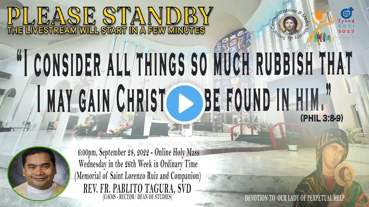 #SVDat147Anniversary Live Now | Online Holy Mass & Devotion to Our Lady Of Perpetual Help - 6:00pm, Wednesday in the Twenty Fourth Week in Ordinary Time, September 14, 2022. (Feast of the Exaltation of the Holy Cross) This Holy Mass is celebrated via online and presided by the Rev. Fr. Ronald Rey Espartinez, SVD (DSJDW - Vice Rector) at the Diocesan Shrine of Jesus the Divine Word at Christ the King Mission Seminary, Quezon City. 1st Reading: NM 21:4B-9 Responsorial Psalm: PS 78:1BC-2, 34-35, 36-37, 38 “Do not forget the works of the Lord!” 2nd Reading: PHIL 2:6-11 Alleluia: “We adore you, O Christ, and we bless you, because by your Cross you have redeemed the world.” Gospel: JN 3:13-17 * For Mass Intentions: www.bit.ly/shrineintentions For Special Masses: www.bit.ly/specialonlinemass * This online mass/ video is available for your online participation in the Eucharist. You are invited to share the video with your family and friends. Watch/ Like/ Follow/ Share/ Subscribe to this channel for alerts and notifications on Daily Masses, Liturgical Services and other videos. (ctto: To All Pictures/ Music/ Videos used - No Copyright Infringement Intended.) * May GOD bless you and your family always and in all ways! #LIVEmass #SVD #DSJDW #CtKMS #SVDmission #DivineWord #ThinkSVD #PromotionToLOVEtheWORDofGOD #WitnessToTheWord #ThinkMission #commitedToHISmission #DSJDWholymassLIVE #RootedInTheWORD #SVDonlineMass “May the darkness of sin and the night of unbelief vanish before the light of the word and the spirit of grace. And may the Heart of Jesus live in every heart! Amen.” (St. Arnold Janssen, 1837-1909) #NEWnormalAtTheShrine